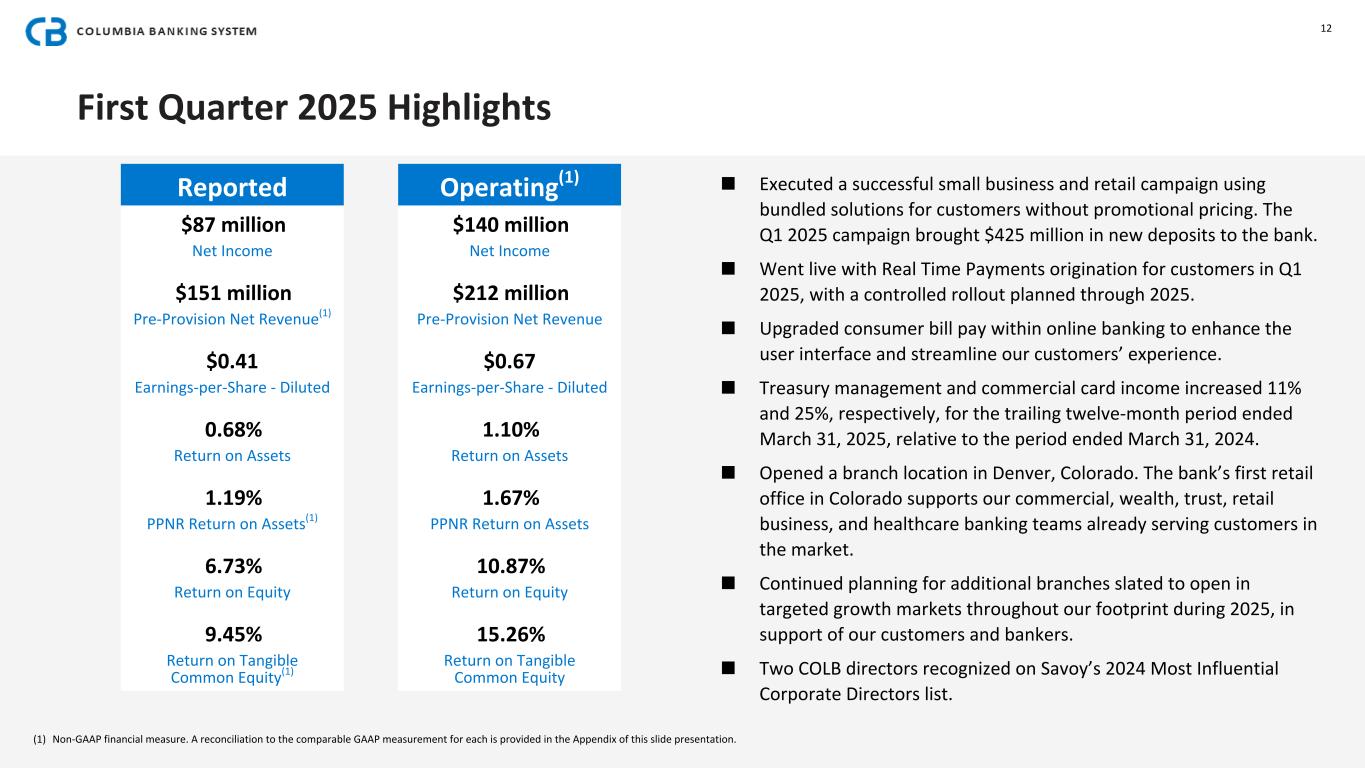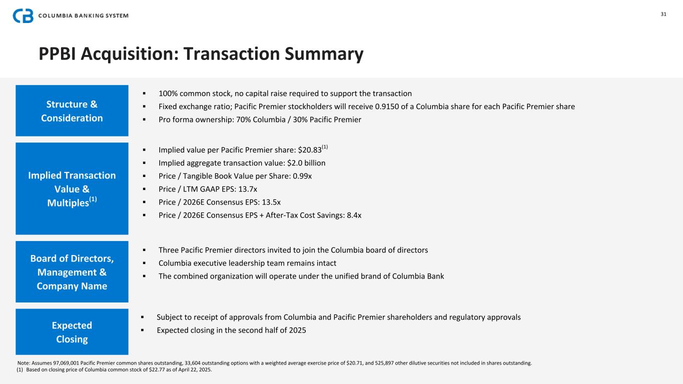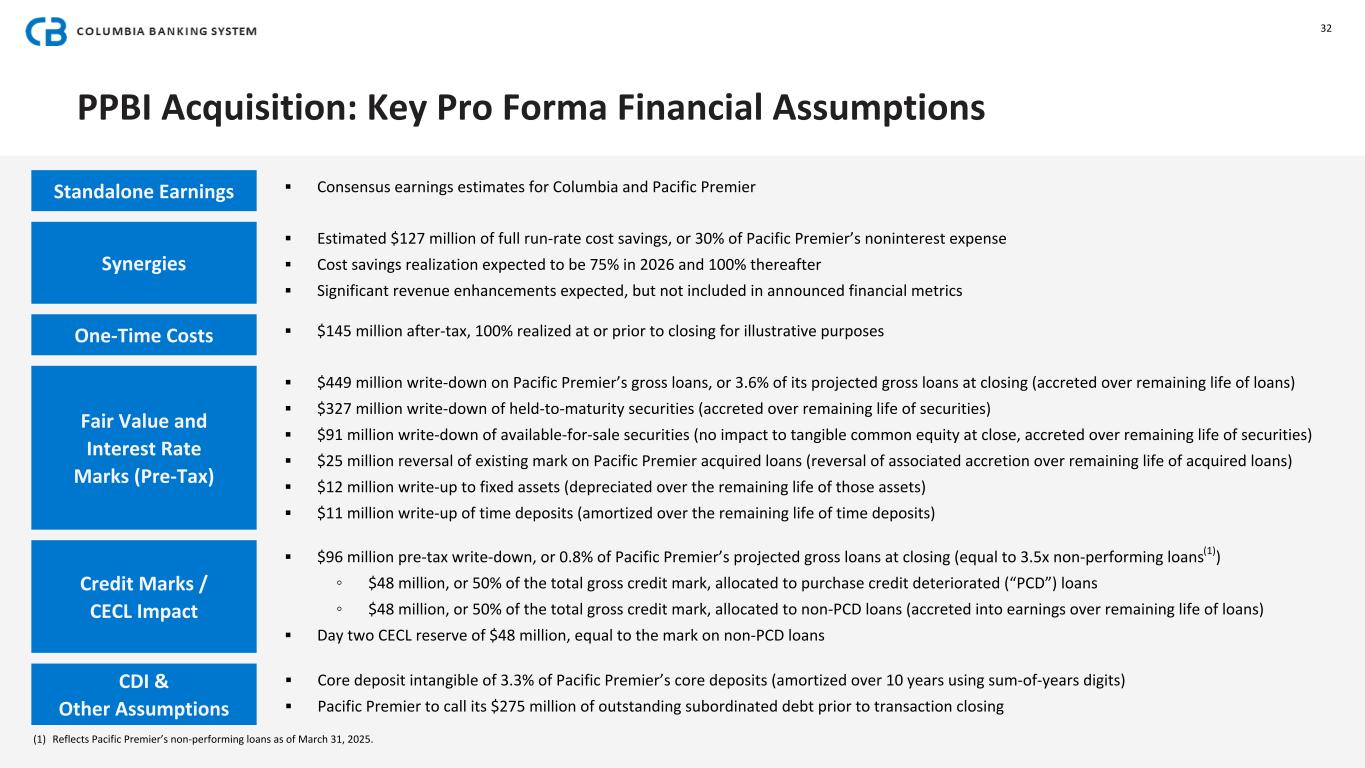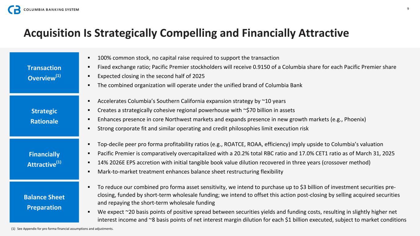 Disclaimer (continued) IMPORTANT ADDITIONAL INFORMATION AND WHERE TO FIND IT In connection with the proposed Transaction, Columbia will file with the SEC a Registration Statement on Form S-4 that will include a Joint Proxy Statement of Columbia and Pacific Premier and a Prospectus of Columbia, as well as other relevant documents concerning the Transaction. Certain matters in respect of the Transaction involving Columbia and Pacific Premier will be submitted to Columbia’s and Pacific Premier’s shareholders or stockholders, as applicable, for their consideration. This communication does not constitute an offer to sell or the solicitation of an offer to buy any securities or a solicitation of any vote or approval, nor shall there be any sale of securities, in any jurisdiction in which such offer, solicitation or sale would be unlawful prior to registration or qualification under the securities laws of any such jurisdiction. INVESTORS, COLUMBIA SHAREHOLDERS AND PACIFIC PREMIER STOCKHOLDERS ARE URGED TO READ THE REGISTRATION STATEMENT AND THE JOINT PROXY STATEMENT/PROSPECTUS REGARDING THE TRANSACTION WHEN THEY BECOME AVAILABLE AND ANY OTHER RELEVANT DOCUMENTS FILED WITH THE SEC IN CONNECTION WITH THE TRANSACTION, AS WELL AS ANY AMENDMENTS OR SUPPLEMENTS TO THOSE DOCUMENTS, BECAUSE THEY WILL CONTAIN IMPORTANT INFORMATION. Shareholders or stockholders, as applicable, will be able to obtain a free copy of the definitive joint proxy statement/prospectus, as well as other filings containing information about the Transaction, Columbia and Pacific Premier, without charge, at the SEC’s website, www.sec.gov. Copies of the joint proxy statement/prospectus and the filings with the SEC that will be incorporated by reference in the joint proxy statement/prospectus can also be obtained, without charge, by directing a request to Columbia Banking System, Inc., Attention: Investor Relations, 1301 A Street, Tacoma, WA 98402-4200, (503) 727-4100 or to Pacific Premier Bancorp, Inc., Attention: Corporate Secretary, 17901 Von Karman Avenue, Suite 1200, Irvine, CA 92614, (949) 864-8000. PARTICIPANTS IN THE SOLICITATION Columbia, Pacific Premier, and certain of their respective directors and executive officers may be deemed to be participants in the solicitation of proxies from Columbia shareholders or Pacific Premier stockholders in connection with the Transaction under the rules of the SEC. Information regarding Columbia’s directors and executive officers is available in the sections entitled “Directors, Executive Officers and Corporate Governance” and “Security Ownership of Certain Beneficial Owners and Management and Related Stockholder Matters” in Columbia’s Annual Report on Form 10-K for the fiscal year ended December 31, 2024, which was filed with the SEC on February 25, 2025 (available here); in the sections entitled “Board Structure and Compensation,” “Compensation Discussion and Analysis,” “Compensation Tables,” “Information about Executive Officers,” “Beneficial Ownership of Directors and Executive Officers” and “Certain Relationships and Related Transactions” in Columbia’s definitive proxy statement relating to its 2025 Annual Meeting of Shareholders, which was filed with the SEC on April 3, 2025 (available here); and other documents filed by Columbia with the SEC. Information regarding Pacific Premier’s directors and executive officers is available in the sections entitled “Directors, Executive Officers and Corporate Governance” and “Security Ownership of Certain Beneficial Owners and Management and Related Stockholder Matters” in Pacific Premier’s Annual Report on Form 10-K for the fiscal year ended December 31, 2024, which was filed with the SEC on February 28, 2025 (available here); in the sections entitled “Compensation of Non-Employee Directors,” “Security Ownership of Directors and Executive Officers,” “Certain Relationships and Related Transactions,” “Summary Compensation Table,” “Employment Agreements, Salary Continuation Plans, Severance, and Change-in-Control Payments,” and “Summary of Potential Termination Payments” in Pacific Premier’s definitive proxy statement relating to its 2025 Annual Meeting of Stockholders, which was filed with the SEC on April 7, 2025 (available here); and other documents filed by Pacific Premier with the SEC. To the extent holdings of Columbia common stock by the directors and executive officers of Columbia or holdings of Pacific Premier common stock by directors and executive officers of Pacific Premier have changed from the amounts held by such persons as reflected in the documents described above, such changes have been or will be reflected on Statements of Change in Ownership on Form 4 filed with the SEC. Other information regarding the participants in the proxy solicitation and a description of their direct and indirect interests, by security holdings or otherwise, will be contained in the joint proxy statement/prospectus relating to the Transaction. Free copies of this document may be obtained as described in the preceding paragraph. NON-GAAP FINANCIAL MEASURES In addition to results presented in accordance with GAAP, this presentation contains certain non-GAAP financial measures. A reconciliation of GAAP to non-GAAP measures is included in the Appendix. The Company believes presenting certain non-GAAP financial measures provides investors with information useful in understanding our financial performance, our performance trends, and our financial position. We utilize these measures for internal planning and forecasting purposes, and operating pre-provision net revenue and operating return on tangible common equity are also used as part of our incentive compensation program for our executive officers. We, as well as securities analysts, investors, and other interested parties, also use these measures to compare peer company operating performance. We believe that our presentation 
