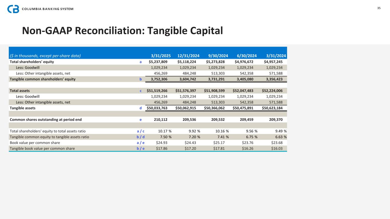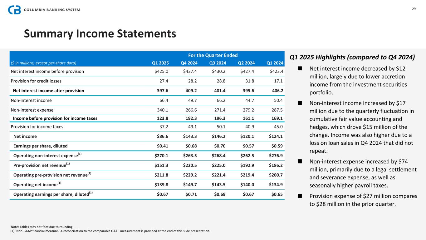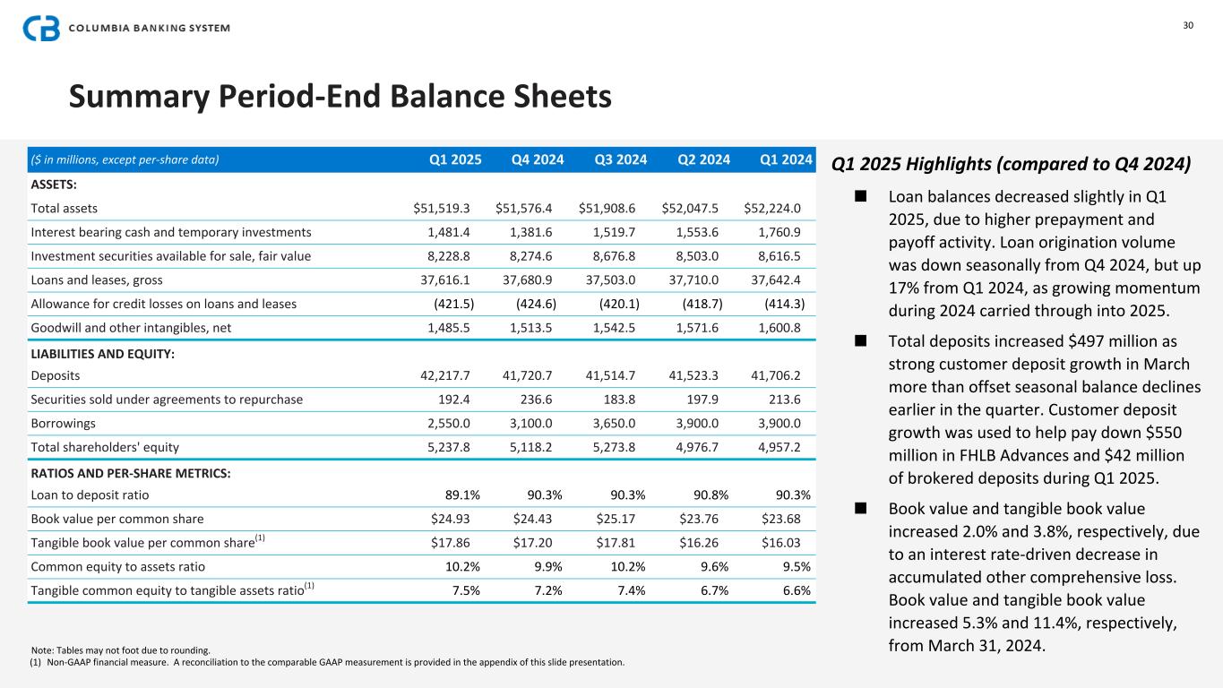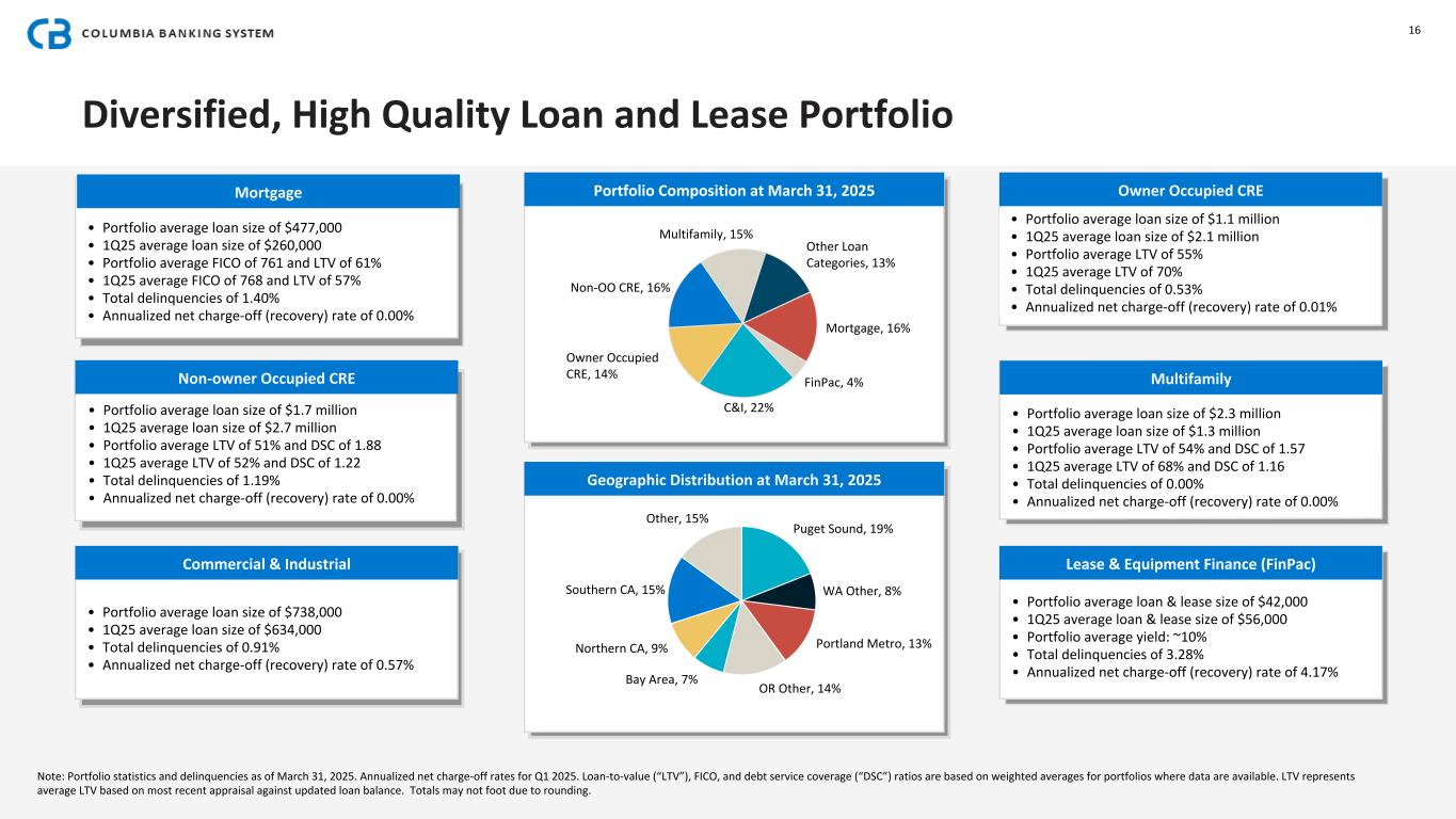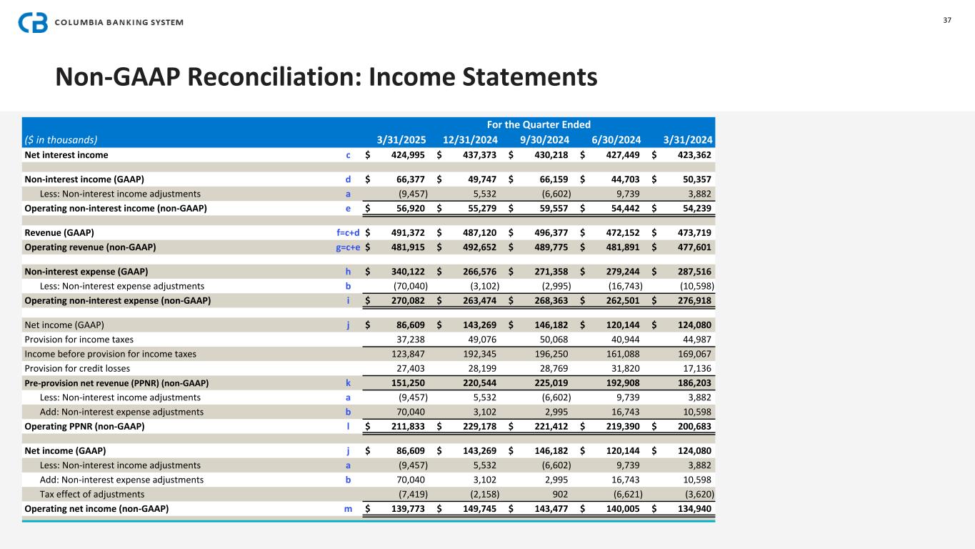 Disclaimer (continued) IMPORTANT ADDITIONAL INFORMATION AND WHERE TO FIND IT In connection with the proposed Transaction, Columbia will file with the SEC a Registration Statement on Form S-4 that will include a Joint Proxy Statement of Columbia and Pacific Premier and a Prospectus of Columbia, as well as other relevant documents concerning the Transaction. Certain matters in respect of the Transaction involving Columbia and Pacific Premier will be submitted to Columbia’s and Pacific Premier’s shareholders or stockholders, as applicable, for their consideration. This communication does not constitute an offer to sell or the solicitation of an offer to buy any securities or a solicitation of any vote or approval, nor shall there be any sale of securities, in any jurisdiction in which such offer, solicitation or sale would be unlawful prior to registration or qualification under the securities laws of any such jurisdiction. INVESTORS, COLUMBIA SHAREHOLDERS AND PACIFIC PREMIER STOCKHOLDERS ARE URGED TO READ THE REGISTRATION STATEMENT AND THE JOINT PROXY STATEMENT/PROSPECTUS REGARDING THE TRANSACTION WHEN THEY BECOME AVAILABLE AND ANY OTHER RELEVANT DOCUMENTS FILED WITH THE SEC IN CONNECTION WITH THE TRANSACTION, AS WELL AS ANY AMENDMENTS OR SUPPLEMENTS TO THOSE DOCUMENTS, BECAUSE THEY WILL CONTAIN IMPORTANT INFORMATION. Shareholders or stockholders, as applicable, will be able to obtain a free copy of the definitive joint proxy statement/prospectus, as well as other filings containing information about the Transaction, Columbia and Pacific Premier, without charge, at the SEC’s website, www.sec.gov. Copies of the joint proxy statement/prospectus and the filings with the SEC that will be incorporated by reference in the joint proxy statement/prospectus can also be obtained, without charge, by directing a request to Columbia Banking System, Inc., Attention: Investor Relations, 1301 A Street, Tacoma, WA 98402-4200, (503) 727-4100 or to Pacific Premier Bancorp, Inc., Attention: Corporate Secretary, 17901 Von Karman Avenue, Suite 1200, Irvine, CA 92614, (949) 864-8000. PARTICIPANTS IN THE SOLICITATION Columbia, Pacific Premier, and certain of their respective directors and executive officers may be deemed to be participants in the solicitation of proxies from Columbia shareholders or Pacific Premier stockholders in connection with the Transaction under the rules of the SEC. Information regarding Columbia’s directors and executive officers is available in the sections entitled “Directors, Executive Officers and Corporate Governance” and “Security Ownership of Certain Beneficial Owners and Management and Related Stockholder Matters” in Columbia’s Annual Report on Form 10-K for the fiscal year ended December 31, 2024, which was filed with the SEC on February 25, 2025 (available here); in the sections entitled “Board Structure and Compensation,” “Compensation Discussion and Analysis,” “Compensation Tables,” “Information about Executive Officers,” “Beneficial Ownership of Directors and Executive Officers” and “Certain Relationships and Related Transactions” in Columbia’s definitive proxy statement relating to its 2025 Annual Meeting of Shareholders, which was filed with the SEC on April 3, 2025 (available here); and other documents filed by Columbia with the SEC. Information regarding Pacific Premier’s directors and executive officers is available in the sections entitled “Directors, Executive Officers and Corporate Governance” and “Security Ownership of Certain Beneficial Owners and Management and Related Stockholder Matters” in Pacific Premier’s Annual Report on Form 10-K for the fiscal year ended December 31, 2024, which was filed with the SEC on February 28, 2025 (available here); in the sections entitled “Compensation of Non-Employee Directors,” “Security Ownership of Directors and Executive Officers,” “Certain Relationships and Related Transactions,” “Summary Compensation Table,” “Employment Agreements, Salary Continuation Plans, Severance, and Change-in-Control Payments,” and “Summary of Potential Termination Payments” in Pacific Premier’s definitive proxy statement relating to its 2025 Annual Meeting of Stockholders, which was filed with the SEC on April 7, 2025 (available here); and other documents filed by Pacific Premier with the SEC. To the extent holdings of Columbia common stock by the directors and executive officers of Columbia or holdings of Pacific Premier common stock by directors and executive officers of Pacific Premier have changed from the amounts held by such persons as reflected in the documents described above, such changes have been or will be reflected on Statements of Change in Ownership on Form 4 filed with the SEC. Other information regarding the participants in the proxy solicitation and a description of their direct and indirect interests, by security holdings or otherwise, will be contained in the joint proxy statement/prospectus relating to the Transaction. Free copies of this document may be obtained as described in the preceding paragraph. NON-GAAP FINANCIAL MEASURES In addition to results presented in accordance with GAAP, this presentation contains certain non-GAAP financial measures. A reconciliation of GAAP to non-GAAP measures is included in the Appendix. The Company believes presenting certain non-GAAP financial measures provides investors with information useful in understanding our financial performance, our performance trends, and our financial position. We utilize these measures for internal planning and forecasting purposes, and operating pre-provision net revenue and operating return on tangible common equity are also used as part of our incentive compensation program for our executive officers. We, as well as securities analysts, investors, and other interested parties, also use these measures to compare peer company operating performance. We believe that our presentation 