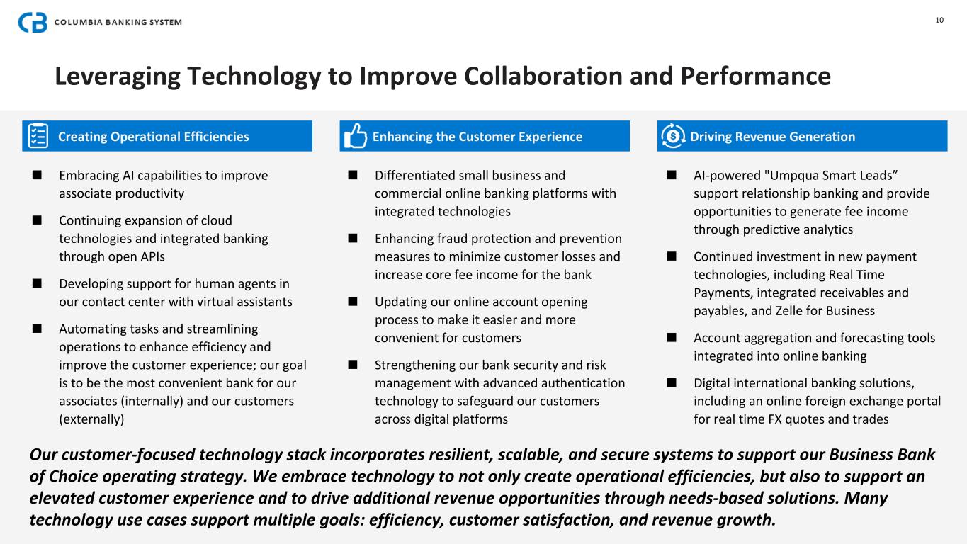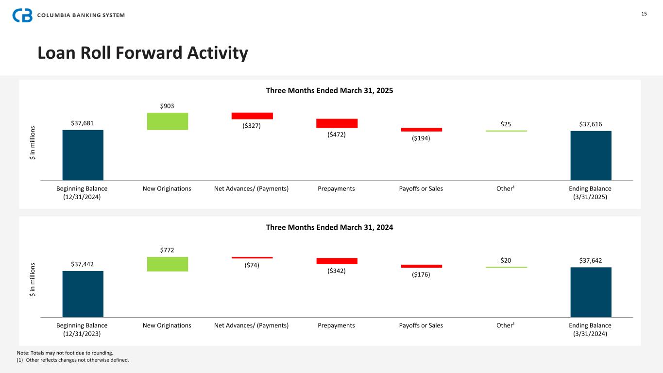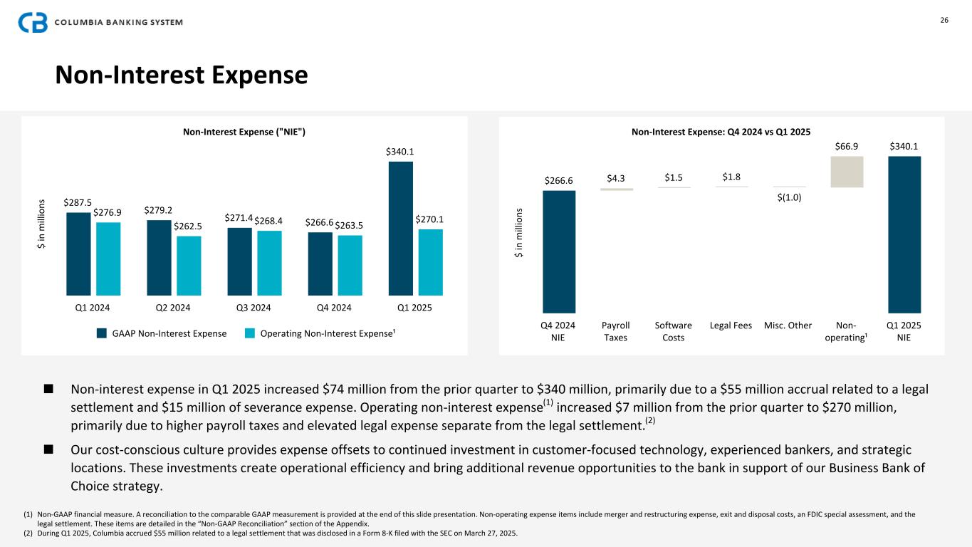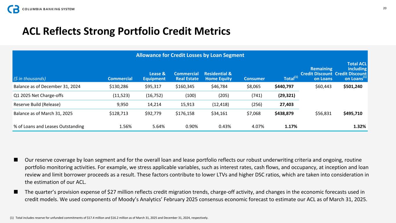 Disclaimer (continued) IMPORTANT ADDITIONAL INFORMATION AND WHERE TO FIND IT In connection with the proposed Transaction, Columbia will file with the SEC a Registration Statement on Form S-4 that will include a Joint Proxy Statement of Columbia and Pacific Premier and a Prospectus of Columbia, as well as other relevant documents concerning the Transaction. Certain matters in respect of the Transaction involving Columbia and Pacific Premier will be submitted to Columbia’s and Pacific Premier’s shareholders or stockholders, as applicable, for their consideration. This communication does not constitute an offer to sell or the solicitation of an offer to buy any securities or a solicitation of any vote or approval, nor shall there be any sale of securities, in any jurisdiction in which such offer, solicitation or sale would be unlawful prior to registration or qualification under the securities laws of any such jurisdiction. INVESTORS, COLUMBIA SHAREHOLDERS AND PACIFIC PREMIER STOCKHOLDERS ARE URGED TO READ THE REGISTRATION STATEMENT AND THE JOINT PROXY STATEMENT/PROSPECTUS REGARDING THE TRANSACTION WHEN THEY BECOME AVAILABLE AND ANY OTHER RELEVANT DOCUMENTS FILED WITH THE SEC IN CONNECTION WITH THE TRANSACTION, AS WELL AS ANY AMENDMENTS OR SUPPLEMENTS TO THOSE DOCUMENTS, BECAUSE THEY WILL CONTAIN IMPORTANT INFORMATION. Shareholders or stockholders, as applicable, will be able to obtain a free copy of the definitive joint proxy statement/prospectus, as well as other filings containing information about the Transaction, Columbia and Pacific Premier, without charge, at the SEC’s website, www.sec.gov. Copies of the joint proxy statement/prospectus and the filings with the SEC that will be incorporated by reference in the joint proxy statement/prospectus can also be obtained, without charge, by directing a request to Columbia Banking System, Inc., Attention: Investor Relations, 1301 A Street, Tacoma, WA 98402-4200, (503) 727-4100 or to Pacific Premier Bancorp, Inc., Attention: Corporate Secretary, 17901 Von Karman Avenue, Suite 1200, Irvine, CA 92614, (949) 864-8000. PARTICIPANTS IN THE SOLICITATION Columbia, Pacific Premier, and certain of their respective directors and executive officers may be deemed to be participants in the solicitation of proxies from Columbia shareholders or Pacific Premier stockholders in connection with the Transaction under the rules of the SEC. Information regarding Columbia’s directors and executive officers is available in the sections entitled “Directors, Executive Officers and Corporate Governance” and “Security Ownership of Certain Beneficial Owners and Management and Related Stockholder Matters” in Columbia’s Annual Report on Form 10-K for the fiscal year ended December 31, 2024, which was filed with the SEC on February 25, 2025 (available here); in the sections entitled “Board Structure and Compensation,” “Compensation Discussion and Analysis,” “Compensation Tables,” “Information about Executive Officers,” “Beneficial Ownership of Directors and Executive Officers” and “Certain Relationships and Related Transactions” in Columbia’s definitive proxy statement relating to its 2025 Annual Meeting of Shareholders, which was filed with the SEC on April 3, 2025 (available here); and other documents filed by Columbia with the SEC. Information regarding Pacific Premier’s directors and executive officers is available in the sections entitled “Directors, Executive Officers and Corporate Governance” and “Security Ownership of Certain Beneficial Owners and Management and Related Stockholder Matters” in Pacific Premier’s Annual Report on Form 10-K for the fiscal year ended December 31, 2024, which was filed with the SEC on February 28, 2025 (available here); in the sections entitled “Compensation of Non-Employee Directors,” “Security Ownership of Directors and Executive Officers,” “Certain Relationships and Related Transactions,” “Summary Compensation Table,” “Employment Agreements, Salary Continuation Plans, Severance, and Change-in-Control Payments,” and “Summary of Potential Termination Payments” in Pacific Premier’s definitive proxy statement relating to its 2025 Annual Meeting of Stockholders, which was filed with the SEC on April 7, 2025 (available here); and other documents filed by Pacific Premier with the SEC. To the extent holdings of Columbia common stock by the directors and executive officers of Columbia or holdings of Pacific Premier common stock by directors and executive officers of Pacific Premier have changed from the amounts held by such persons as reflected in the documents described above, such changes have been or will be reflected on Statements of Change in Ownership on Form 4 filed with the SEC. Other information regarding the participants in the proxy solicitation and a description of their direct and indirect interests, by security holdings or otherwise, will be contained in the joint proxy statement/prospectus relating to the Transaction. Free copies of this document may be obtained as described in the preceding paragraph. NON-GAAP FINANCIAL MEASURES In addition to results presented in accordance with GAAP, this presentation contains certain non-GAAP financial measures. A reconciliation of GAAP to non-GAAP measures is included in the Appendix. The Company believes presenting certain non-GAAP financial measures provides investors with information useful in understanding our financial performance, our performance trends, and our financial position. We utilize these measures for internal planning and forecasting purposes, and operating pre-provision net revenue and operating return on tangible common equity are also used as part of our incentive compensation program for our executive officers. We, as well as securities analysts, investors, and other interested parties, also use these measures to compare peer company operating performance. We believe that our presentation 