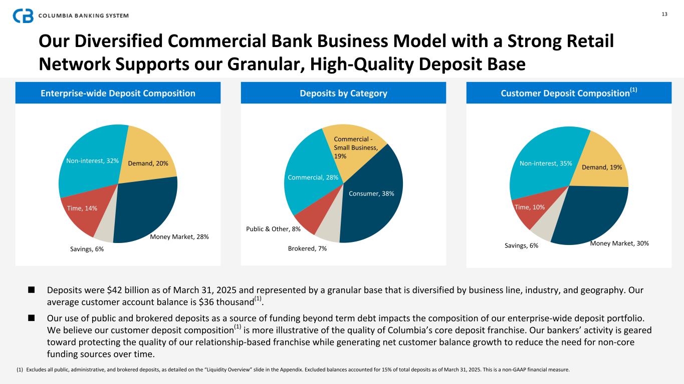 First Quarter 2025 Highlights 12 ■ Executed a successful small business and retail campaign using bundled solutions for customers without promotional pricing. The Q1 2025 campaign brought $425 million in new deposits to the bank. ■ Went live with Real Time Payments origination for customers in Q1 2025, with a controlled rollout planned through 2025. ■ Upgraded consumer bill pay within online banking to enhance the user interface and streamline our customers’ experience. ■ Treasury management and commercial card income increased 11% and 25%, respectively, for the trailing twelve-month period ended March 31, 2025, relative to the period ended March 31, 2024. ■ Opened a branch location in Denver, Colorado. The bank’s first retail office in Colorado supports our commercial, wealth, trust, retail business, and healthcare banking teams already serving customers in the market. ■ Continued planning for additional branches slated to open in targeted growth markets throughout our footprint during 2025, in support of our customers and bankers. ■ Two COLB directors recognized on Savoy’s 2024 Most Influential Corporate Directors list. Reported Operating(1) $87 million $140 million Net Income Net Income $151 million $212 million Pre-Provision Net Revenue(1) Pre-Provision Net Revenue $0.41 $0.67 Earnings-per-Share - Diluted Earnings-per-Share - Diluted 0.68% 1.10% Return on Assets Return on Assets 1.19% 1.67% PPNR Return on Assets(1) PPNR Return on Assets 6.73% 10.87% Return on Equity Return on Equity 9.45% 15.26% Return on Tangible Common Equity(1) Return on Tangible Common Equity (1) Non-GAAP financial measure. A reconciliation to the comparable GAAP measurement for each is provided in the Appendix of this slide presentation.