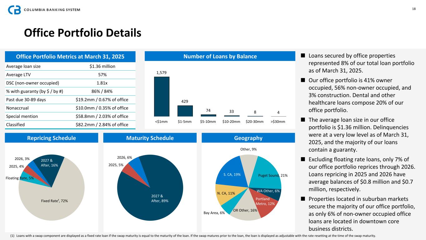 Office Portfolio Details Puget Sound, 21% WA Other, 6% Portland Metro, 12% OR Other, 16% Bay Area, 6% N. CA, 11% S. CA, 19% Other, 9% Office Portfolio Metrics at March 31, 2025 Average loan size $1.36 million Average LTV 57% DSC (non-owner occupied) 1.81x % with guaranty (by $ / by #) 86% / 84% Past due 30-89 days $19.2mm / 0.67% of office Nonaccrual $10.0mm / 0.35% of office Special mention $58.8mm / 2.03% of office Classified $82.2mm / 2.84% of office Number of Loans by Balance Geography 18 ■ Loans secured by office properties represented 8% of our total loan portfolio as of March 31, 2025. ■ Our office portfolio is 41% owner occupied, 56% non-owner occupied, and 3% construction. Dental and other healthcare loans compose 20% of our office portfolio. ■ The average loan size in our office portfolio is $1.36 million. Delinquencies were at a very low level as of March 31, 2025, and the majority of our loans contain a guaranty. ■ Excluding floating rate loans, only 7% of our office portfolio reprices through 2026. Loans repricing in 2025 and 2026 have average balances of $0.8 million and $0.7 million, respectively. ■ Properties located in suburban markets secure the majority of our office portfolio, as only 6% of non-owner occupied office loans are located in downtown core business districts. 1,746 441 71 38 7 6 <$1mm $1-5mm $5-10mm $10-20mm $20-30mm >$30mm 2025, 4% 2026, 3% 2027 & After, 16% Fixed Rate¹, 72% Floating Rate, 5% Repricing Schedule (1) Loans with a swap component are displayed as a fixed rate loan if the swap maturity is equal to the maturity of the loan. If the swap matures prior to the loan, the loan is displayed as adjustable with the rate resetting at the time of the swap maturity. 2025, 5% 2026, 6% 2027 & After, 89% Maturity Schedule , 19 8 9 6 7 1,579 29 4 3 8 4