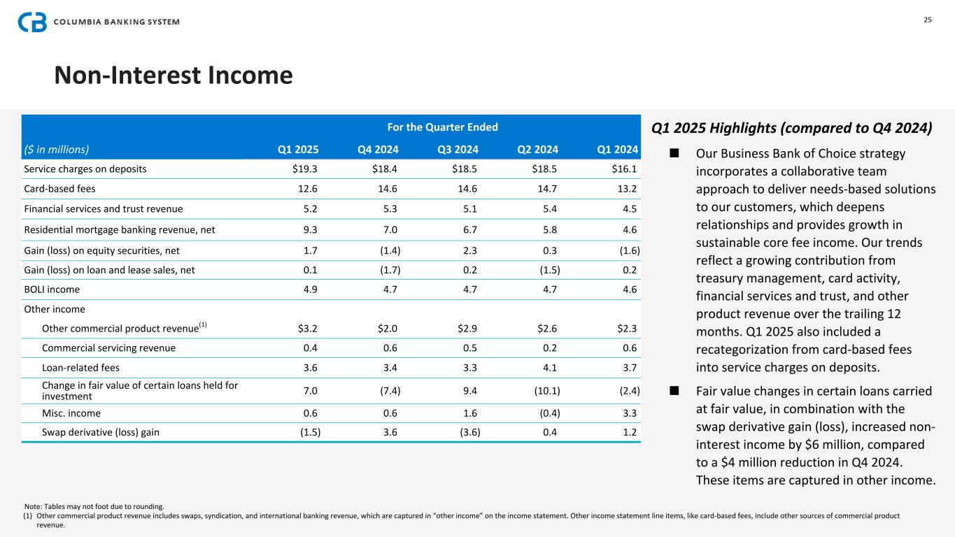 Select Asset and Liability Maturity and Repricing Schedules (in Months) at March 31, 2025 ($ in millions) <=3 4 to 6 7 to 12 13 to 24 25 to 36 36+ Total % Total(3) Loans Fixed (maturity)(2) $360 $170 $258 $707 $1,219 $10,515 $13,229 35% Floating (repricing)(2) 13,529 — — — — — 13,529 36% Adjustable (repricing) 667 309 522 1,509 1,235 6,992 11,234 30% Total Loans $14,556 $479 $780 $2,216 $2,454 $17,507 $37,992 100% Time deposits (maturity)(4) $3,536 $1,376 $921 $140 $15 $14 $6,002 Average rate(4) 4.10% 3.81% 3.44% 1.80% 0.29% 0.27% 3.86% Term debt (maturity) $2,550 $— $— $— $— $— $2,550 Average rate 4.47% 4.47% Interest Rate Sensitivity 23 Note: Tables may not foot due to rounding. Loan totals on this slide do not include purchase accounting adjustments. Deferred fees and costs also drive variances between loan totals on this slide and loan totals in the earnings press release. (1) For the scenarios shown, the interest rate simulations assume a parallel and sustained shift in market interest rates ratably over a twelve-month period (ramp) or immediately (shock). The simulation repricing betas applied to interest-bearing deposits in the rising rate and declining rate scenarios are 55% and 54%, respectively, for March 31, 2025. Additional data related to interest rate simulations are available in Columbia’s Form 10-K for the fiscal year ended December 31, 2024. (2) Commercial tranche loans that mature in one month are included in the floating rate loan category, not the fixed rate loan category, as these loans reprice in a manner similar to floating rate loans. (3) Floating rate loans are indexed to prime (8% of the total loan portfolio) and 1-month underlying interest rates (28% of the total loan portfolio). When adjustable rate loans reprice, they are indexed to interest rates that span 1-month tenors to 10-year tenors as well as the prime rate; the most prevalent underlying index rates are 6-month tenors (17% of the total loan portfolio) and 5-year tenors (6% of the total loan portfolio). (4) Time deposits maturing in 3 months or less include $1.5 billion in customer CDs at an average rate of 3.91% and $2.0 billion in brokered CDs at an average rate of 4.38%. (5) Loans were grouped into three buckets: (1) No Floor: no contractual floor on the loan; (2) At Floor: current rate = floor; (3) Above Floor: current rate exceeds floor. The amount above the floor was based on the current margin plus the current index assuming the loan repriced on March 31, 2025. The adjustable loans may not reprice until well into the future, depending on the timing and size of interest rate changes. Interest Rate Simulation Impact on Net Interest Income at March 31, 2025(1) Ramp Shock Year 1 Year 2 Year 1 Year 2 Up 200 basis points (0.7)% 0.8% (1.1)% 2.4% Up 100 basis points (0.3)% 0.4% (0.5)% 1.2% Down 100 basis points 0.3% (0.6)% 0.4% (1.5)% Down 200 basis points 1.0% (1.3)% 1.1% (3.2)% Down 300 basis points 1.9% (2.3)% 1.7% (5.6)% Downward Rate Change to Move to Floor at March 31, 2025 ($ in millions) Floating Loans Adjustable Loans Above Floor Total <25 basis points $19 $36 $55 26 to 50 basis points 114 63 177 51 to 75 basis points 62 49 111 76 to 100 basis points 124 73 197 101 to 125 basis points 35 102 137 126 to 150 basis points 52 123 175 >150 basis points 3,913 9,101 13,014 Total $4,319 $9,547 $13,866 Floors: Floating and Adjustable Rate Loans at March 31, 2025 ($ in millions) No Floor(5) At Floor(5) Above Floor(5) Total Floating $8,894 $316 $4,319 $13,529 Adjustable 1,552 135 9,547 11,234 Total $10,446 $451 $13,866 $24,763 % of Total 42% 2% 56% 100%