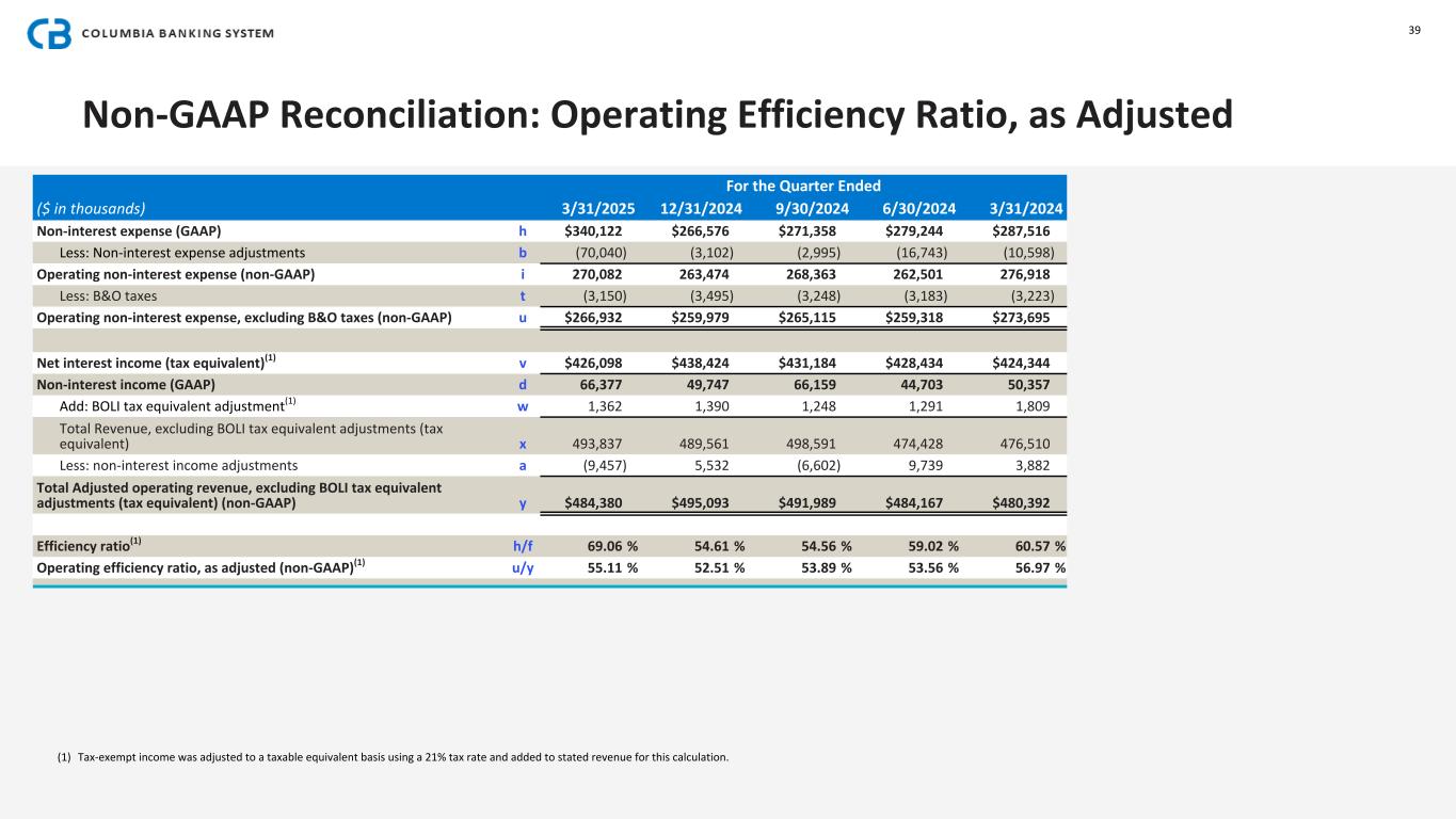 Non-GAAP Reconciliation: Earnings Per-Share and Performance Metrics For the Quarter Ended ($ in thousands, except per-share data) 3/31/2025 12/31/2024 9/30/2024 6/30/2024 3/31/2024 Select Per-Share & Performance Metrics Earnings per share - basic j/r $ 0.41 $ 0.69 $ 0.70 $ 0.58 $ 0.60 Earnings per share - diluted j/s $ 0.41 $ 0.68 $ 0.70 $ 0.57 $ 0.59 Efficiency ratio(1) h/f 69.06 % 54.61 % 54.56 % 59.02 % 60.57 % Non-interest expense to average assets h/n 2.68 % 2.06 % 2.08 % 2.16 % 2.22 % Return on average assets j/n 0.68 % 1.10 % 1.12 % 0.93 % 0.96 % Return on average tangible assets j/o 0.70 % 1.14 % 1.15 % 0.96 % 0.99 % PPNR return on average assets k/n 1.19 % 1.70 % 1.72 % 1.49 % 1.44 % Return on average common equity j/p 6.73 % 10.91 % 11.36 % 9.85 % 10.01 % Return on average tangible common equity j/q 9.45 % 15.41 % 16.34 % 14.55 % 14.82 % Operating Per-Share & Performance Metrics Operating earnings per share - basic m/r $ 0.67 $ 0.72 $ 0.69 $ 0.67 $ 0.65 Operating earnings per share - diluted m/s $ 0.67 $ 0.71 $ 0.69 $ 0.67 $ 0.65 Operating efficiency ratio, as adjusted(1) u/y 55.11 % 52.51 % 53.89 % 53.56 % 56.97 % Operating non-interest expense to average assets i/n 2.13 % 2.03 % 2.05 % 2.03 % 2.14 % Operating return on average assets m/n 1.10 % 1.15 % 1.10 % 1.08 % 1.04 % Operating return on average tangible assets m/o 1.13 % 1.19 % 1.13 % 1.12 % 1.08 % Operating PPNR return on average assets l/n 1.67 % 1.77 % 1.69 % 1.70 % 1.55 % Operating return on average common equity m/p 10.87 % 11.40 % 11.15 % 11.47 % 10.89 % Operating return on average tangible common equity m/q 15.26 % 16.11 % 16.04 % 16.96 % 16.12 % (1) Tax-exempt income was adjusted to a taxable equivalent basis using a 21% tax rate and added to stated revenue for this calculation. 38