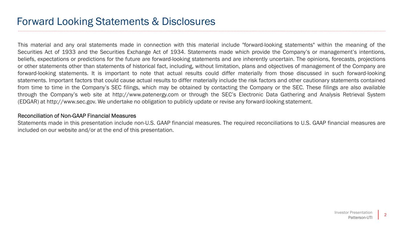 2Investor Presentation Patterson-UTI This material and any oral statements made in connection with this material include "forward-looking statements" within the meaning of the Securities Act of 1933 and the Securities Exchange Act of 1934. Statements made which provide the Company’s or management’s intentions, beliefs, expectations or predictions for the future are forward-looking statements and are inherently uncertain. The opinions, forecasts, projections or other statements other than statements of historical fact, including, without limitation, plans and objectives of management of the Company are forward-looking statements. It is important to note that actual results could differ materially from those discussed in such forward-looking statements. Important factors that could cause actual results to differ materially include the risk factors and other cautionary statements contained from time to time in the Company’s SEC filings, which may be obtained by contacting the Company or the SEC. These filings are also available through the Company’s web site at http://www.patenergy.com or through the SEC’s Electronic Data Gathering and Analysis Retrieval System (EDGAR) at http://www.sec.gov. We undertake no obligation to publicly update or revise any forward-looking statement. Reconciliation of Non-GAAP Financial Measures Statements made in this presentation include non-U.S. GAAP financial measures. The required reconciliations to U.S. GAAP financial measures are included on our website and/or at the end of this presentation. Forward Looking Statements & Disclosures