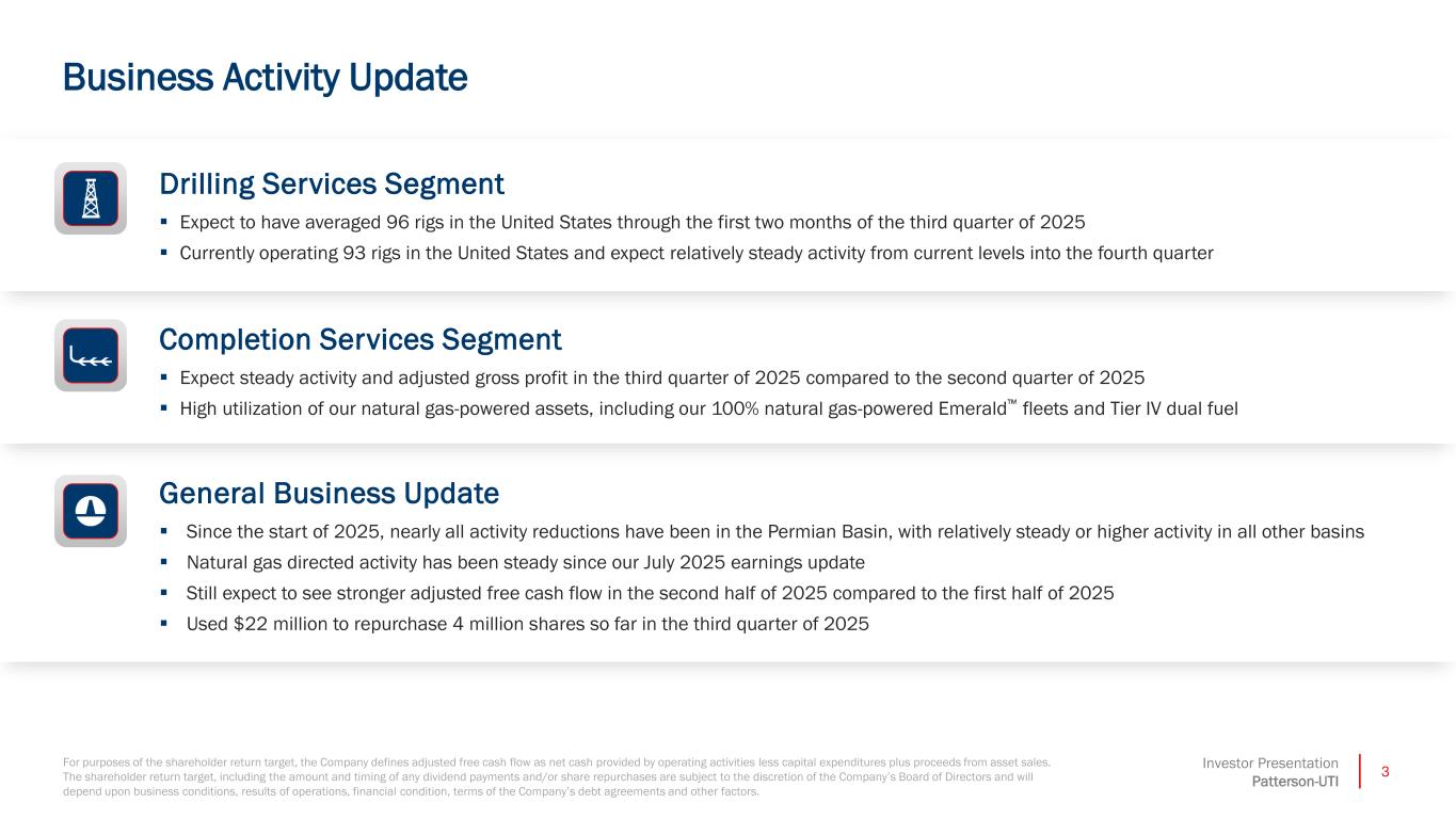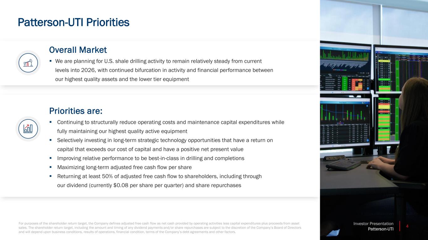 3Investor Presentation Patterson-UTI Z Z For purposes of the shareholder return target, the Company defines adjusted free cash flow as net cash provided by operating activities less capital expenditures plus proceeds from asset sales. The shareholder return target, including the amount and timing of any dividend payments and/or share repurchases are subject to the discretion of the Company’s Board of Directors and will depend upon business conditions, results of operations, financial condition, terms of the Company’s debt agreements and other factors. Z Business Activity Update Drilling Services Segment ▪ Expect to have averaged 96 rigs in the United States through the first two months of the third quarter of 2025 ▪ Currently operating 93 rigs in the United States and expect relatively steady activity from current levels into the fourth quarter Completion Services Segment ▪ Expect steady activity and adjusted gross profit in the third quarter of 2025 compared to the second quarter of 2025 ▪ High utilization of our natural gas-powered assets, including our 100% natural gas-powered Emerald fleets and Tier IV dual fuel General Business Update ▪ Since the start of 2025, nearly all activity reductions have been in the Permian Basin, with relatively steady or higher activity in all other basins ▪ Natural gas directed activity has been steady since our July 2025 earnings update ▪ Still expect to see stronger adjusted free cash flow in the second half of 2025 compared to the first half of 2025 ▪ Used $22 million to repurchase 4 million shares so far in the third quarter of 2025