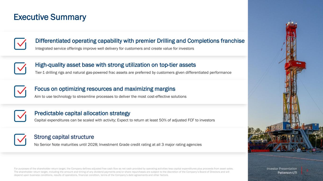 4Investor Presentation Patterson-UTI Z For purposes of the shareholder return target, the Company defines adjusted free cash flow as net cash provided by operating activities less capital expenditures plus proceeds from asset sales. The shareholder return target, including the amount and timing of any dividend payments and/or share repurchases are subject to the discretion of the Company’s Board of Directors and will depend upon business conditions, results of operations, financial condition, terms of the Company’s debt agreements and other factors. Z Overall Market ▪ We are planning for U.S. shale drilling activity to remain relatively steady from current levels into 2026, with continued bifurcation in activity and financial performance between our highest quality assets and the lower tier equipment Priorities are: ▪ Continuing to structurally reduce operating costs and maintenance capital expenditures while fully maintaining our highest quality active equipment ▪ Selectively investing in long-term strategic technology opportunities that have a return on capital that exceeds our cost of capital and have a positive net present value ▪ Improving relative performance to be best-in-class in drilling and completions ▪ Maximizing long-term adjusted free cash flow per share ▪ Returning at least 50% of adjusted free cash flow to shareholders, including through our dividend (currently $0.08 per share per quarter) and share repurchases Patterson-UTI Priorities