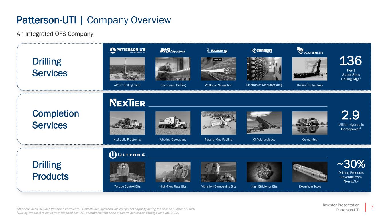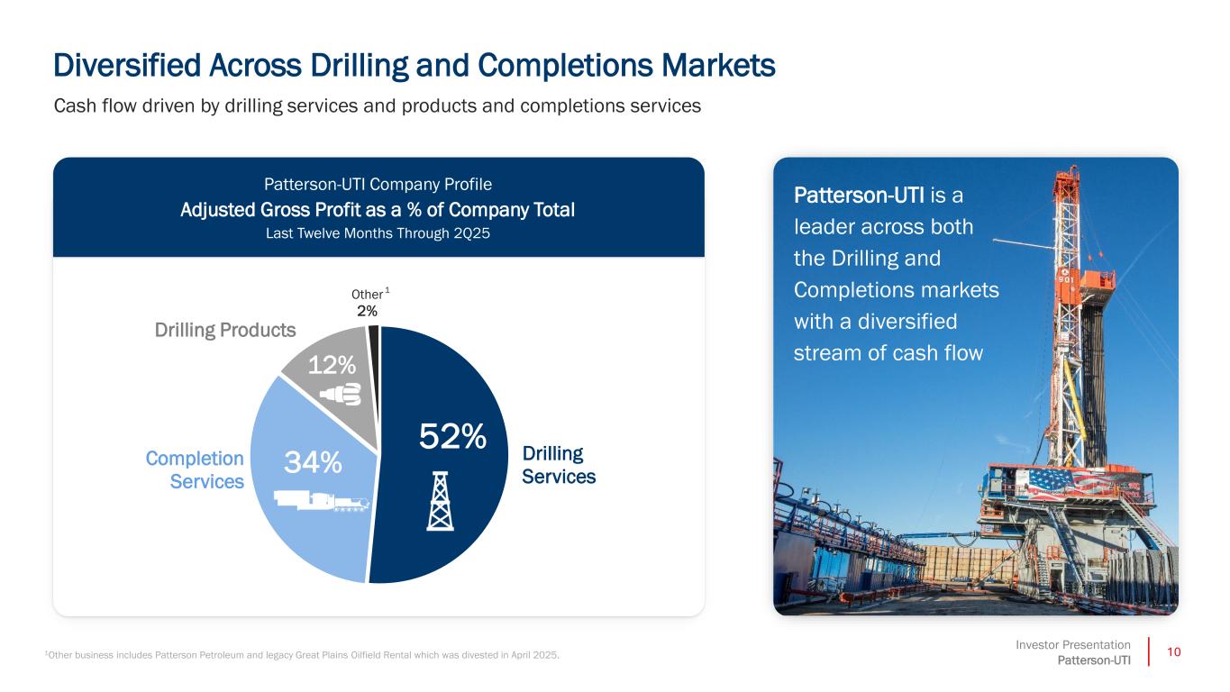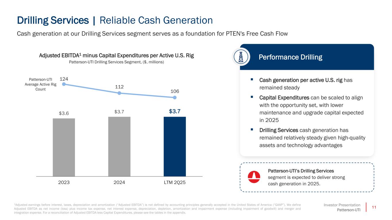 10Investor Presentation Patterson-UTI Diversified Across Drilling and Completions Markets 1Other business includes Patterson Petroleum and legacy Great Plains Oilfield Rental which was divested in April 2025. Cash flow driven by drilling services and products and completions services Drilling Services Completion Services Drilling Products Other 2% 52% 12% 34% 1 Patterson-UTI is a leader across both the Drilling and Completions markets with a diversified stream of cash flow Patterson-UTI Company Profile Adjusted Gross Profit as a % of Company Total Last Twelve Months Through 2Q25