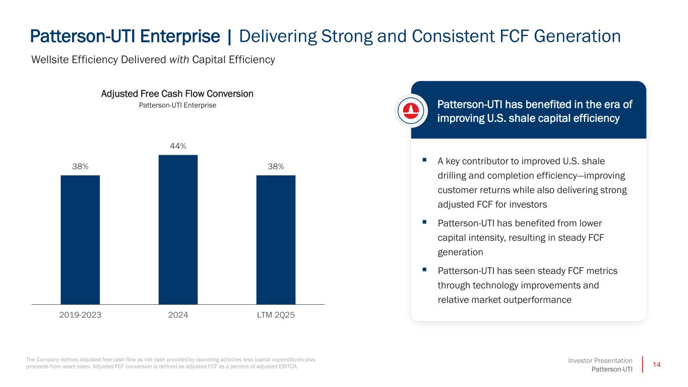 13Investor Presentation Patterson-UTI Drilling Products | Outpacing Industry Activity Rapid deployment of incremental design improvements create a demonstrable & sustainable advantage 1On August 14, 2023, we formed our drilling products segment through the acquisition of Ulterra Drilling Technologies. The table includes revenue and activity that predates the close of that acquisition, which presents the information as if the acquisition occurred on January 1, 2023. 2Enverus U.S. Active Rigs Drill Bit Outperformance ▪ Rapid Innovation and Customization: Ulterra leverages proprietary software to analyze drilling data and optimize product performance, resulting in consistent market outperformance ▪ Realizing Operational Synergies: Drilling Products market share on PTEN operated rigs is up more than 10% since we closed the acquisition ▪ International Growth Potential: Drilling Products 3-year international revenue CAGR of >20% through 2024 0 100 200 300 400 500 600 700 800 900 $0 $15,000 $30,000 $45,000 $60,000 Q1 2023 Q2 2023 Q3 2023 Q4 2023 Q1 2024 Q2 2024 Q3 2024 Q4 2024 Q1 2025 Q2 2025 Pro Forma1 Drilling Products Segment Pro Forma1 U.S. Revenue per U.S. Industry Rig per Month U.S. Active Rigs U.S. Industry Drilling Rig Count2 More than just drill bits: Downhole tools and new product innovation revenue more than doubled in 2024