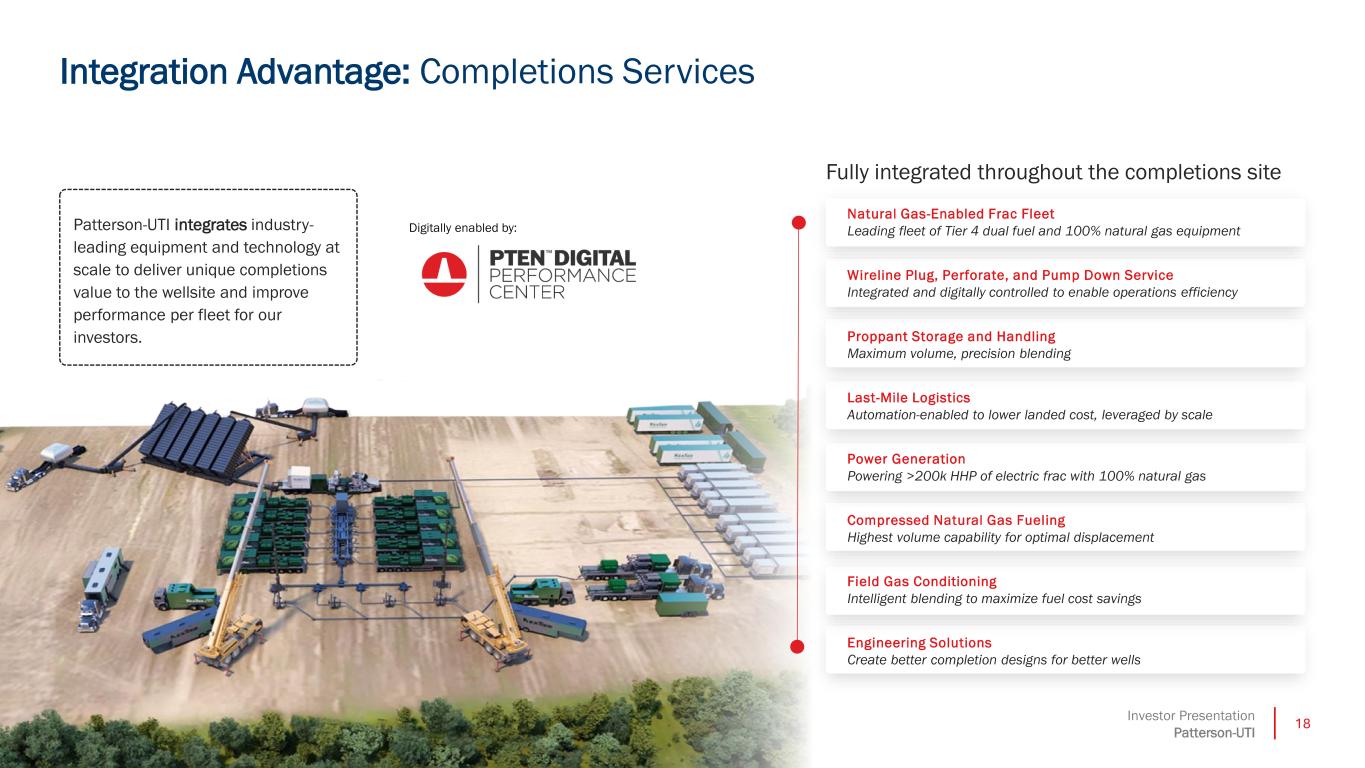 17Investor Presentation Patterson-UTI Patterson-UTI's integrated drilling platform can improve drilling days on pad, creating value for our customers and an opportunity for a performance-based returns premium for our investors. Integration Advantage: Drilling Services and Products Digitally enabled by: Contract Drilling | Patterson-UTI Drilling Diverse rig fleet complete with innovative software solutions Natural Gas Fueling, Well Cementing | NexTier Integrated solutions unlocked through merger Drill Bits | Ulterra Leading provider of PDC drill bits in North America Directional Services | MS Directional Directional drilling, MWD, well planning and downhole motors Survey Correction | Superior QC Leader in survey management technology and wellbore placement Power Generation | Patterson-UTI >1gW of mobile power generation capacity across our rig fleet Controls and Energy Management | Current Power Engineer electrical and automation equipment Rig Equipment Design and Manufacturing | Warrior Design and manufacture advanced pipe-handling equipment Fully integrated throughout the drill site