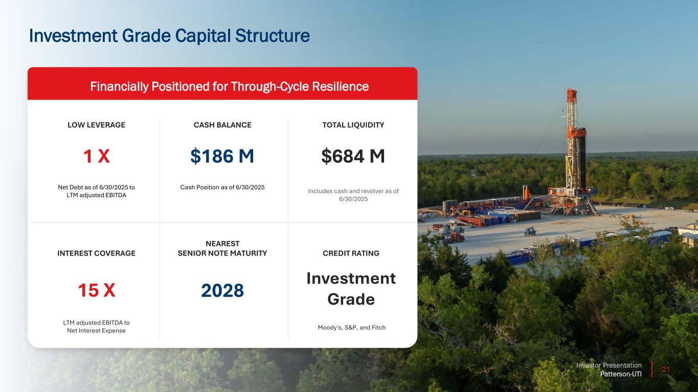 20Investor Presentation Patterson-UTI Organic Investing Strategy Targets Strong FCF Conversion Invest to protect and extend our operational advantage Strategic Allocation Target strategic high-return investments that drive returns accretion for PTEN shareholders Winning Foundation Allocation Strategy Strong Balance Sheet Investment Grade Credit Rating; Low Leverage and Strong Liquidity; No Senior Note maturities until 2028 Repeatable Shareholder Return Program Expect to return at least 50% of adjusted Free Cash Flow annually to shareholders1 through dividends and repurchases Capital Allocation Framework Maximize Shareholder Value and Financial Returns 1For purposes of the shareholder return target, the Company defines adjusted free cash flow as net cash provided by operating activities less capital expenditures plus proceeds from asset sales. The shareholder return target, including the amount and timing of any dividend payments and/or share repurchases are subject to the discretion of the Company’s Board of Directors and will depend upon business conditions, results of operations, financial condition, terms of the Company’s debt agreements and other factors