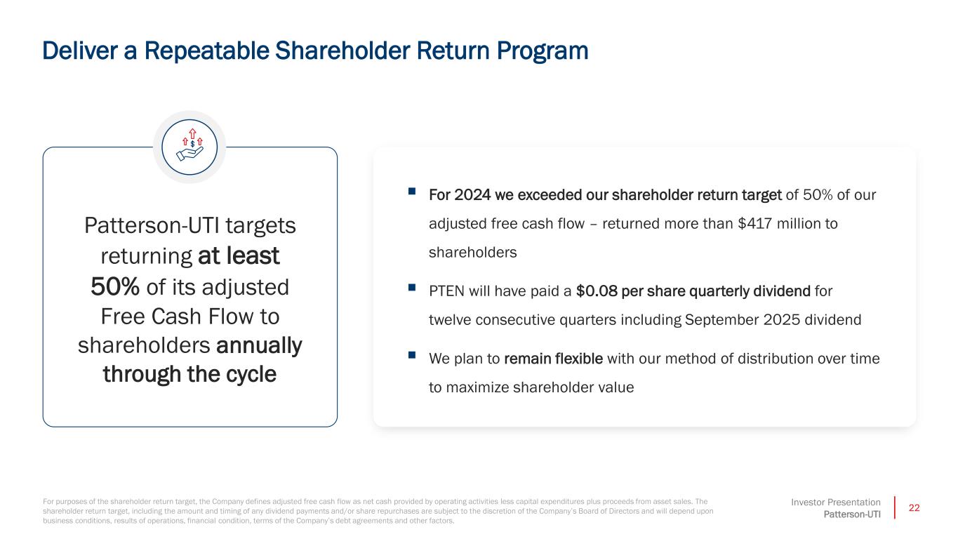 22Investor Presentation Patterson-UTI Deliver a Repeatable Shareholder Return Program For purposes of the shareholder return target, the Company defines adjusted free cash flow as net cash provided by operating activities less capital expenditures plus proceeds from asset sales. The shareholder return target, including the amount and timing of any dividend payments and/or share repurchases are subject to the discretion of the Company’s Board of Directors and will depend upon business conditions, results of operations, financial condition, terms of the Company’s debt agreements and other factors. Patterson-UTI targets returning at least 50% of its adjusted Free Cash Flow to shareholders annually through the cycle ▪ For 2024 we exceeded our shareholder return target of 50% of our adjusted free cash flow – returned more than $417 million to shareholders ▪ PTEN will have paid a $0.08 per share quarterly dividend for twelve consecutive quarters including September 2025 dividend ▪ We plan to remain flexible with our method of distribution over time to maximize shareholder value