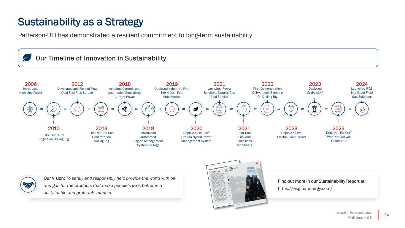 24Investor Presentation Patterson-UTI Sustainability as a Strategy Our Vision: To safely and responsibly help provide the world with oil and gas for the products that make people’s lives better in a sustainable and profitable manner Find out more in our Sustainability Report at: https://esg.patenergy.com/ Patterson-UTI has demonstrated a resilient commitment to long-term sustainability Our Timeline of Innovation in Sustainability 2006 Introduced High-Line Power 2010 First Dual Fuel Engine on Drilling Rig 2012 Developed and Fielded First Dual Fuel Frac Spread 2018 Acquired Controls and Automation Specialists, Current Power 2019 Deployed Industry’s First Tier-4 Dual Fuel Frac Spread 2021 Launched Power Solutions Natural Gas Fuel Service 2022 First Demonstration Of Hydrogen Blending On Drilling Rig 2023 Deployed GridAssist® 2024 Launched iFGS Intelligent Field Gas Solutions 2013 First Natural Gas Generator on Drilling Rig 2019 Introduced Automated Engine Management System for Rigs 2020 Deployed EcoCell® Lithium Hybrid Power Management System 2021 Real-Time Fuel and Emissions Monitoring 2023 Deployed First Electric Frac Spread 2023 Deployed EcoCell® With Natural Gas Generators