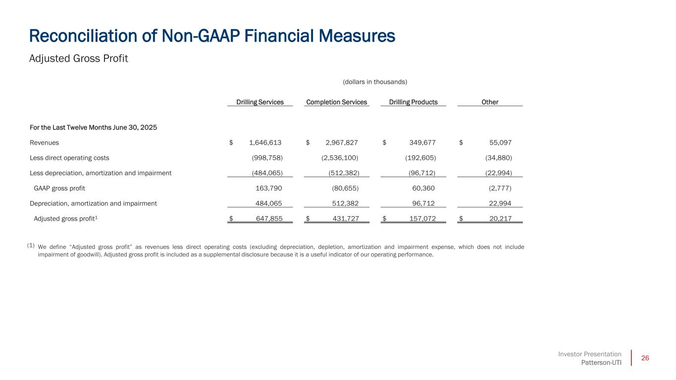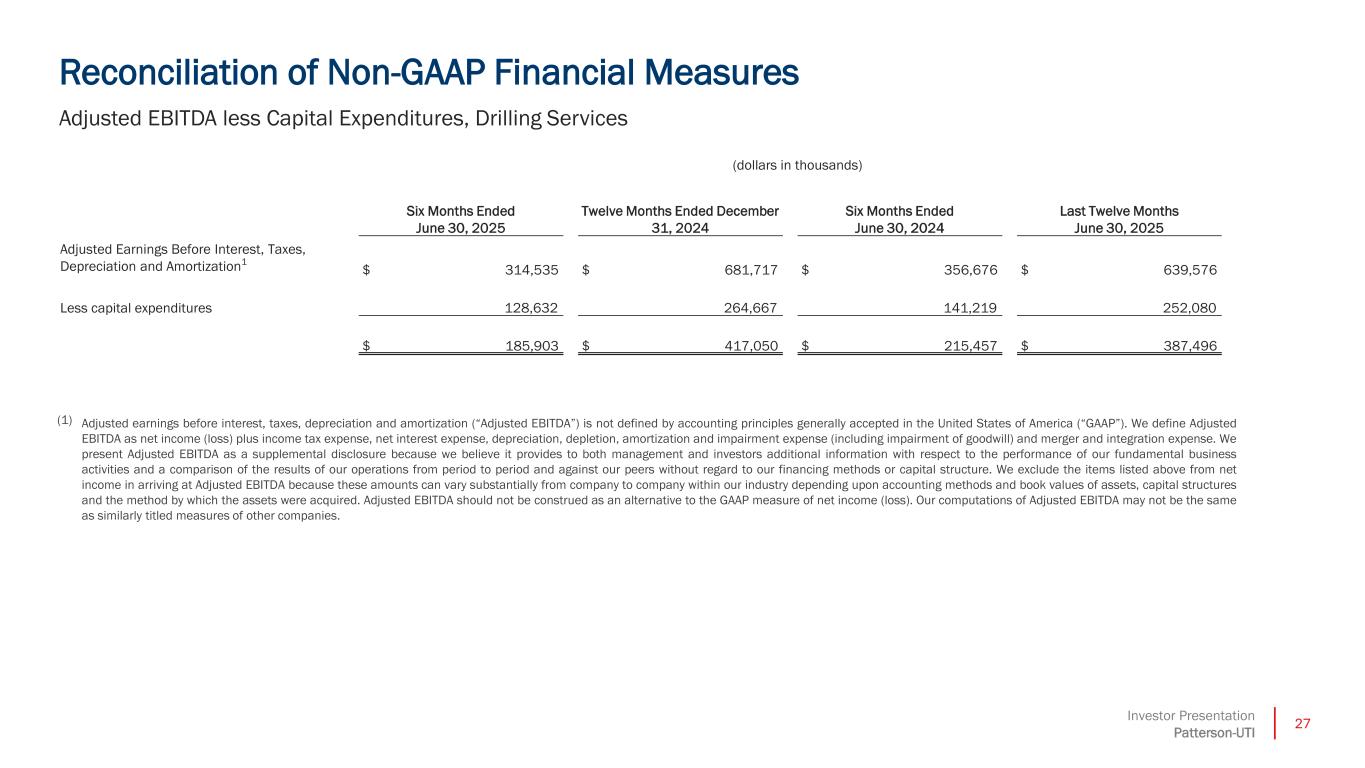 26Investor Presentation Patterson-UTI Reconciliation of Non-GAAP Financial Measures Adjusted Gross Profit (dollars in thousands) Drilling Services Completion Services Drilling Products Other For the Last Twelve Months June 30, 2025 Revenues $ 1,646,613 $ 2,967,827 $ 349,677 $ 55,097 Less direct operating costs (998,758) (2,536,100) (192,605) (34,880) Less depreciation, amortization and impairment (484,065) (512,382) (96,712) (22,994) GAAP gross profit 163,790 (80,655) 60,360 (2,777) Depreciation, amortization and impairment 484,065 512,382 96,712 22,994 Adjusted gross profit1 $ 647,855 $ 431,727 $ 157,072 $ 20,217 (1) We define “Adjusted gross profit” as revenues less direct operating costs (excluding depreciation, depletion, amortization and impairment expense, which does not include impairment of goodwill). Adjusted gross profit is included as a supplemental disclosure because it is a useful indicator of our operating performance.