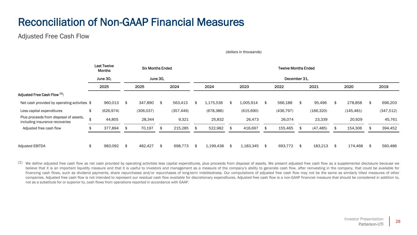 27Investor Presentation Patterson-UTI Reconciliation of Non-GAAP Financial Measures Adjusted EBITDA less Capital Expenditures, Drilling Services (1) Adjusted earnings before interest, taxes, depreciation and amortization (“Adjusted EBITDA”) is not defined by accounting principles generally accepted in the United States of America (“GAAP”). We define Adjusted EBITDA as net income (loss) plus income tax expense, net interest expense, depreciation, depletion, amortization and impairment expense (including impairment of goodwill) and merger and integration expense. We present Adjusted EBITDA as a supplemental disclosure because we believe it provides to both management and investors additional information with respect to the performance of our fundamental business activities and a comparison of the results of our operations from period to period and against our peers without regard to our financing methods or capital structure. We exclude the items listed above from net income in arriving at Adjusted EBITDA because these amounts can vary substantially from company to company within our industry depending upon accounting methods and book values of assets, capital structures and the method by which the assets were acquired. Adjusted EBITDA should not be construed as an alternative to the GAAP measure of net income (loss). Our computations of Adjusted EBITDA may not be the same as similarly titled measures of other companies. (dollars in thousands) Six Months Ended June 30, 2025 Twelve Months Ended December 31, 2024 Six Months Ended June 30, 2024 Last Twelve Months June 30, 2025 Adjusted Earnings Before Interest, Taxes, Depreciation and Amortization1 $ 314,535 $ 681,717 $ 356,676 $ 639,576 Less capital expenditures 128,632 264,667 141,219 252,080 $ 185,903 $ 417,050 $ 215,457 $ 387,496