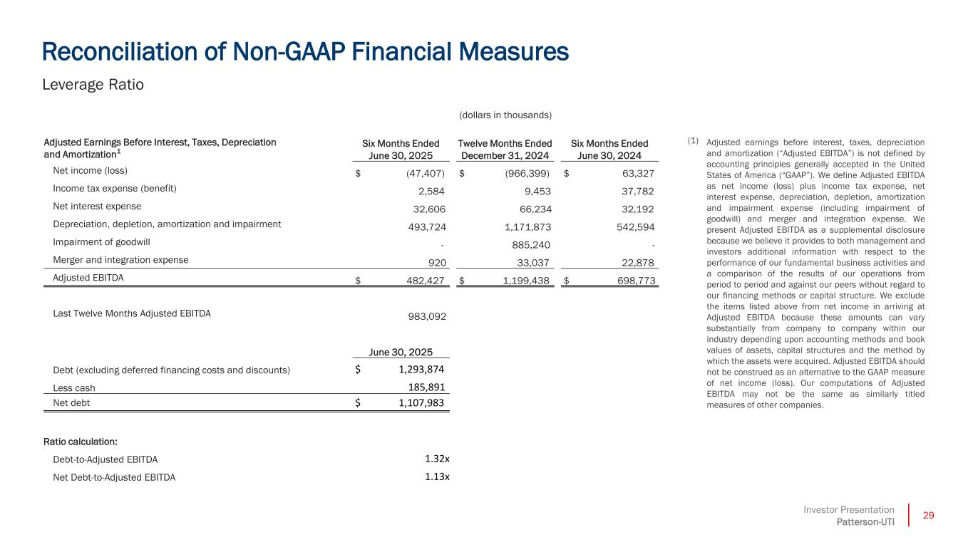 28Investor Presentation Patterson-UTI Reconciliation of Non-GAAP Financial Measures Adjusted Free Cash Flow (1) We define adjusted free cash flow as net cash provided by operating activities less capital expenditures, plus proceeds from disposal of assets. We present adjusted free cash flow as a supplemental disclosure because we believe that it is an important liquidity measure and that it is useful to investors and management as a measure of the company’s ability to generate cash flow, after reinvesting in the company, that could be available for financing cash flows, such as dividend payments, share repurchases and/or repurchases of long-term indebtedness. Our computations of adjusted free cash flow may not be the same as similarly titled measures of other companies. Adjusted free cash flow is not intended to represent our residual cash flow available for discretionary expenditures. Adjusted free cash flow is a non-GAAP financial measure that should be considered in addition to, not as a substitute for or superior to, cash flows from operations reported in accordance with GAAP. (dollars in thousands) Last Twelve Months Six Months Ended Twelve Months Ended June 30, June 30, December 31, 2025 2025 2024 2024 2023 2022 2021 2020 2019 Adjusted Free Cash Flow (1): Net cash provided by operating activities $ 960,013 $ 347,890 $ 563,413 $ 1,175,536 $ 1,005,914 $ 566,188 $ 95,496 $ 278,858 $ 696,203 Less capital expenditures $ (626,974) (306,037) (357,449) (678,386) (615,690) (436,797) (166,320) (145,481) (347,512) Plus proceeds from disposal of assets, including insurance recoveries $ 44,855 28,344 9,321 25,832 26,473 26,074 23,339 20,929 45,761 Adjusted free cash flow $ 377,894 $ 70,197 $ 215,285 $ 522,982 $ 416,697 $ 155,465 $ (47,485) $ 154,306 $ 394,452 Adjusted EBITDA $ 983,092 $ 482,427 $ 698,773 $ 1,199,438 $ 1,183,345 $ 693,772 $ 183,213 $ 174,468 $ 560,486