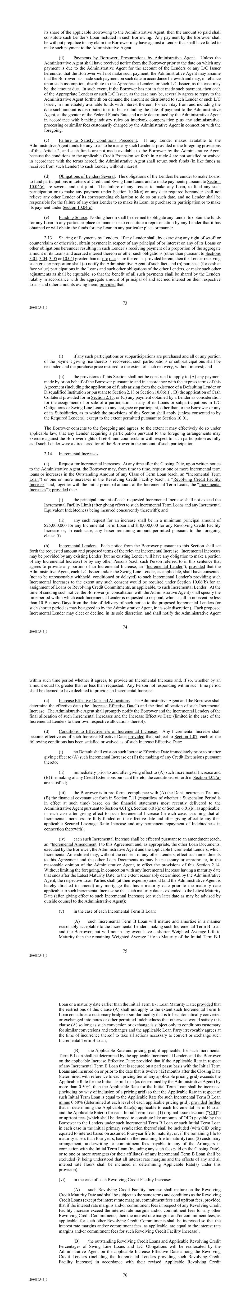 73 208089544_6 its share of the applicable Borrowing to the Administrative Agent, then the amount so paid shall constitute such Lender’s Loan included in such Borrowing. Any payment by the Borrower shall be without prejudice to any claim the Borrower may have against a Lender that shall have failed to make such payment to the Administrative Agent. (ii) Payments by Borrower; Presumptions by Administrative Agent. Unless the Administrative Agent shall have received notice from the Borrower prior to the date on which any payment is due to the Administrative Agent for the account of the Lenders or any L/C Issuer hereunder that the Borrower will not make such payment, the Administrative Agent may assume that the Borrower has made such payment on such date in accordance herewith and may, in reliance upon such assumption, distribute to the Appropriate Lenders or such L/C Issuer, as the case may be, the amount due. In such event, if the Borrower has not in fact made such payment, then each of the Appropriate Lenders or such L/C Issuer, as the case may be, severally agrees to repay to the Administrative Agent forthwith on demand the amount so distributed to such Lender or such L/C Issuer, in immediately available funds with interest thereon, for each day from and including the date such amount is distributed to it to but excluding the date of payment to the Administrative Agent, at the greater of the Federal Funds Rate and a rate determined by the Administrative Agent in accordance with banking industry rules on interbank compensation plus any administrative, processing or similar fees customarily charged by the Administrative Agent in connection with the foregoing. (c) Failure to Satisfy Conditions Precedent. If any Lender makes available to the Administrative Agent funds for any Loan to be made by such Lender as provided in the foregoing provisions of this Article 2, and such funds are not made available to the Borrower by the Administrative Agent because the conditions to the applicable Credit Extension set forth in Article 4 are not satisfied or waived in accordance with the terms hereof, the Administrative Agent shall return such funds (in like funds as received from such Lender) to such Lender, without interest. (d) Obligations of Lenders Several. The obligations of the Lenders hereunder to make Loans, to fund participations in Letters of Credit and Swing Line Loans and to make payments pursuant to Section 10.04(c) are several and not joint. The failure of any Lender to make any Loan, to fund any such participation or to make any payment under Section 10.04(c) on any date required hereunder shall not relieve any other Lender of its corresponding obligation to do so on such date, and no Lender shall be responsible for the failure of any other Lender to so make its Loan, to purchase its participation or to make its payment under Section 10.04(c). (e) Funding Source. Nothing herein shall be deemed to obligate any Lender to obtain the funds for any Loan in any particular place or manner or to constitute a representation by any Lender that it has obtained or will obtain the funds for any Loan in any particular place or manner. 2.13 Sharing of Payments by Lenders. If any Lender shall, by exercising any right of setoff or counterclaim or otherwise, obtain payment in respect of any principal of or interest on any of its Loans or other obligations hereunder resulting in such Lender’s receiving payment of a proportion of the aggregate amount of its Loans and accrued interest thereon or other such obligations (other than pursuant to Sections 3.01, 3.04, 3.05 or 10.04) greater than its pro rata share thereof as provided herein, then the Lender receiving such greater proportion shall (a) notify the Administrative Agent of such fact, and (b) purchase (for cash at face value) participations in the Loans and such other obligations of the other Lenders, or make such other adjustments as shall be equitable, so that the benefit of all such payments shall be shared by the Lenders ratably in accordance with the aggregate amount of principal of and accrued interest on their respective Loans and other amounts owing them; provided that: 74 208089544_6 (i) if any such participations or subparticipations are purchased and all or any portion of the payment giving rise thereto is recovered, such participations or subparticipations shall be rescinded and the purchase price restored to the extent of such recovery, without interest; and (ii) the provisions of this Section shall not be construed to apply to (A) any payment made by or on behalf of the Borrower pursuant to and in accordance with the express terms of this Agreement (including the application of funds arising from the existence of a Defaulting Lender or Disqualified Institution or pursuant to Section 2.18 or Section 10.06(i)), (B) the application of Cash Collateral provided for in Section 2.15, or (C) any payment obtained by a Lender as consideration for the assignment of or sale of a participation in any of its Loans or subparticipations in L/C Obligations or Swing Line Loans to any assignee or participant, other than to the Borrower or any of its Subsidiaries, as to which the provisions of this Section shall apply (unless consented to by the Required Lenders), except to the extent permitted pursuant to Section 10.01. The Borrower consents to the foregoing and agrees, to the extent it may effectively do so under applicable law, that any Lender acquiring a participation pursuant to the foregoing arrangements may exercise against the Borrower rights of setoff and counterclaim with respect to such participation as fully as if such Lender were a direct creditor of the Borrower in the amount of such participation. 2.14 Incremental Increases. (a) Request for Incremental Increases. At any time after the Closing Date, upon written notice to the Administrative Agent, the Borrower may, from time to time, request one or more incremental term loans or increases in th