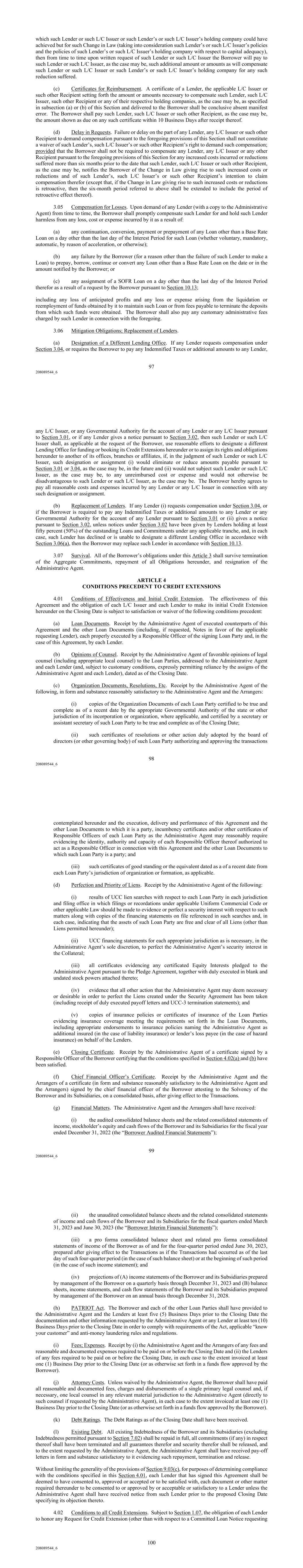 97 208089544_6 which such Lender or such L/C Issuer or such Lender’s or such L/C Issuer’s holding company could have achieved but for such Change in Law (taking into consideration such Lender’s or such L/C Issuer’s policies and the policies of such Lender’s or such L/C Issuer’s holding company with respect to capital adequacy), then from time to time upon written request of such Lender or such L/C Issuer the Borrower will pay to such Lender or such L/C Issuer, as the case may be, such additional amount or amounts as will compensate such Lender or such L/C Issuer or such Lender’s or such L/C Issuer’s holding company for any such reduction suffered. (c) Certificates for Reimbursement. A certificate of a Lender, the applicable L/C Issuer or such other Recipient setting forth the amount or amounts necessary to compensate such Lender, such L/C Issuer, such other Recipient or any of their respective holding companies, as the case may be, as specified in subsection (a) or (b) of this Section and delivered to the Borrower shall be conclusive absent manifest error. The Borrower shall pay such Lender, such L/C Issuer or such other Recipient, as the case may be, the amount shown as due on any such certificate within 10 Business Days after receipt thereof. (d) Delay in Requests. Failure or delay on the part of any Lender, any L/C Issuer or such other Recipient to demand compensation pursuant to the foregoing provisions of this Section shall not constitute a waiver of such Lender’s, such L/C Issuer’s or such other Recipient’s right to demand such compensation; provided that the Borrower shall not be required to compensate any Lender, any L/C Issuer or any other Recipient pursuant to the foregoing provisions of this Section for any increased costs incurred or reductions suffered more than six months prior to the date that such Lender, such L/C Issuer or such other Recipient, as the case may be, notifies the Borrower of the Change in Law giving rise to such increased costs or reductions and of such Lender’s, such L/C Issuer’s or such other Recipient’s intention to claim compensation therefor (except that, if the Change in Law giving rise to such increased costs or reductions is retroactive, then the six-month period referred to above shall be extended to include the period of retroactive effect thereof). 3.05 Compensation for Losses. Upon demand of any Lender (with a copy to the Administrative Agent) from time to time, the Borrower shall promptly compensate such Lender for and hold such Lender harmless from any loss, cost or expense incurred by it as a result of: (a) any continuation, conversion, payment or prepayment of any Loan other than a Base Rate Loan on a day other than the last day of the Interest Period for such Loan (whether voluntary, mandatory, automatic, by reason of acceleration, or otherwise); (b) any failure by the Borrower (for a reason other than the failure of such Lender to make a Loan) to prepay, borrow, continue or convert any Loan other than a Base Rate Loan on the date or in the amount notified by the Borrower; or (c) any assignment of a SOFR Loan on a day other than the last day of the Interest Period therefor as a result of a request by the Borrower pursuant to Section 10.13; including any loss of anticipated profits and any loss or expense arising from the liquidation or reemployment of funds obtained by it to maintain such Loan or from fees payable to terminate the deposits from which such funds were obtained. The Borrower shall also pay any customary administrative fees charged by such Lender in connection with the foregoing. 3.06 Mitigation Obligations; Replacement of Lenders. (a) Designation of a Different Lending Office. If any Lender requests compensation under Section 3.04, or requires the Borrower to pay any Indemnified Taxes or additional amounts to any Lender, 98 208089544_6 any L/C Issuer, or any Governmental Authority for the account of any Lender or any L/C Issuer pursuant to Section 3.01, or if any Lender gives a notice pursuant to Section 3.02, then such Lender or such L/C Issuer shall, as applicable at the request of the Borrower, use reasonable efforts to designate a different Lending Office for funding or booking its Credit Extensions hereunder or to assign its rights and obligations hereunder to another of its offices, branches or affiliates, if, in the judgment of such Lender or such L/C Issuer, such designation or assignment (i) would eliminate or reduce amounts payable pursuant to Section 3.01 or 3.04, as the case may be, in the future and (ii) would not subject such Lender or such L/C Issuer, as the case may be, to any unreimbursed cost or expense and would not otherwise be disadvantageous to such Lender or such L/C Issuer, as the case may be. The Borrower hereby agrees to pay all reasonable costs and expenses incurred by any Lender or any L/C Issuer in connection with any such designation or assignment. (b) Replacement of Lenders. If any Lender (i) requests compensation under Section 3.04, or if the Borrower is required to pay any Indemnified Taxes or additional amounts to any Lender or any Governmental Authority for the account of any Lender pursuant to Section 3.01 or (ii) gives a notice pursuant to Section 3.02, unless notices under Section 3.02 have been given by Lenders holding at least fifty percent (50%) of the outstanding Loans and Commitments under any applicable tranche, and, in each case, such Lender has declined or is unable to designate a different Lending Office in accordance with Section 3.06(a), then the Borrower may replace such Lender in accordance with Section 10.13. 3.07 Survival. All of the Borrower’s obligations under this Article 3 shall survive termination of the Aggregate Commitments, repayment of all Obligations hereunder, and resignation of the Administrative Agent. ARTICLE 4 CONDITIONS PRECEDENT TO CREDIT EXTENSIONS 4.01 Conditions of Effectiveness and Initial Credit Extension. The effectiveness