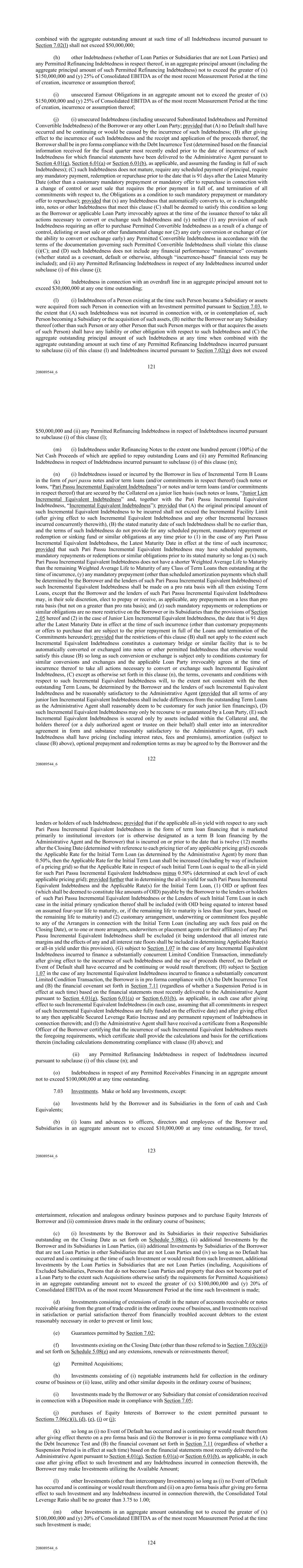 157 208089544_6 access any electronic site established for the Lenders or confidential communications from counsel to or financial advisors of the Administrative Agent or the Lenders and (B) (x) for purposes of any consent to any amendment, waiver or modification of, or any action under, and for the purpose of any direction to the Administrative Agent or any Lender to undertake any action (or refrain from taking any action) under this Agreement or any other Loan Document, each Disqualified Institution will be deemed to have consented in the same proportion as the Lenders that are not Disqualified Institutions consented to such matter, and (y) for purposes of voting on any on any plan of reorganization or plan of liquidation pursuant to any Debtor Relief Laws (a “Bankruptcy Plan”), each Disqualified Institution party hereto hereby agrees (1) not to vote on such Bankruptcy Plan, (2) if such Disqualified Institution does vote on such Bankruptcy Plan notwithstanding the restriction in the foregoing clause (1), such vote will be deemed not to be in good faith and shall be “designated” pursuant to Section 1126(e) of the Bankruptcy Code of the United States (or any similar provision in any other Debtor Relief Laws), and such vote shall not be counted in determining whether the applicable class has accepted or rejected such Bankruptcy Plan in accordance with Section 1126(c) of the Bankruptcy Code of the United States (or any similar provision in any other Debtor Relief Laws) and (3) not to contest any request by any party for a determination by any bankruptcy court (or other applicable court of competent jurisdiction) effectuating the foregoing clause (2). (iv) The Administrative Agent shall have the right, and the Borrower hereby expressly authorizes the Administrative Agent, to (A) post the list of Disqualified Institutions provided by the Borrower and any updates thereto from time to time (collectively, the “DQ List”) on the Platform, including that portion of the Platform that is designated for “public side” Lenders and/or (B) provide the DQ List to each Lender requesting the same. (h) Cashless Settlement. Notwithstanding anything to the contrary contained in this Agreement, any Lender may exchange, continue or rollover all or a portion of its Loans in connection with any refinancing, extension, loan modification or similar transaction permitted by the terms of this Agreement, pursuant to a cashless settlement mechanism approved by the Borrower, the Administrative Agent and such Lender. (i) Open Market Purchases. Notwithstanding anything in this Agreement to the contrary, any Term Lender may, at any time, assign all or a portion of its Initial Term B-1 Loans or any Incremental Term B Loans on a non-pro rata basis to the Borrower through open market purchases, subject to the following limitations: (i) the Borrower shall represent and warrant that, at the time of each such assignment, neither the Borrower nor any of its Subsidiaries shall have any MNPI with respect to the Borrower or any of its Subsidiaries, any securities of the Borrower or any of its Subsidiaries, the Borrower’s ability to perform any obligations under this Agreement or any other Loan Document or any other matter that may be material to a decision by any Lender to participate in any such assignment and prepayment of Term Loans pursuant to this Section, in any case, that has not been previously disclosed in writing to the Administrative Agent and the Lenders (other than because such Lender does not wish to receive MNPI) prior to such time and could reasonably be expected to have a material effect upon, or otherwise be material to, a Lender’s decision to participate in such assignment; (ii) immediately and automatically, without any further action on the part of the Borrower, any Lender, the Administrative Agent or any other Person, upon the effectiveness of such assignment of Initial Term B-1 Loans or Incremental Term B Loans from a Term Lender to the Borrower, such Initial Term B-1 Loans or Incremental Term B Loans and all rights and 158 208089544_6 obligations as a Lender related thereto shall, for all purposes under this Agreement, the other Loan Documents and otherwise, be deemed to be irrevocably prepaid, terminated, extinguished, cancelled and of no further force and effect and the Borrower shall neither obtain nor have any rights as a Lender hereunder or under the other Loan Documents by virtue of such assignment; provided that upon any such retirement and cancellation, the aggregate outstanding principal amount of the Initial Term B-1 Loans or Incremental Term B Loans shall be deemed reduced by the full par value of the aggregate principal amount of the Initial Term B-1 Loans or Incremental Term B Loans so retired and cancelled and each principal installment owing to each Lender participating in such open market purchase shall, as to such retired or cancelled Initial Term B-1 Loans or Incremental Term B Loans, be reduced on a pro rata basis by the full par value of the aggregate principal amount of such Initial Term B-1 Loans or Incremental Term B Loans so retired or cancelled; (iii) no Default or Event of Default shall have occurred and be continuing before or immediately after giving effect to such assignment; (iv) after giving effect to any assignment and prepayment of Term Loans pursuant to this Section and any Indebtedness incurred in connection therewith, the Borrower shall be in pro forma compliance with (A) the Debt Incurrence Test and (B) the financial covenant set forth in Section 7.11 (regardless of whether a Suspension Period is in effect at such time) based on the financial statements most recently delivered to the Administrative Agent pursuant to Section 4.01(g), Section 6.01(a) or Section 6.01(b), as applicable (after giving effect to any then applicable Secured Leverage Ratio Increase); and (v) no prepayment of any Term Loans pursuant to this Section shall be made from the proceeds 