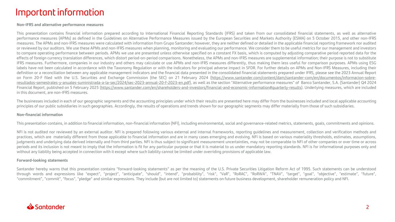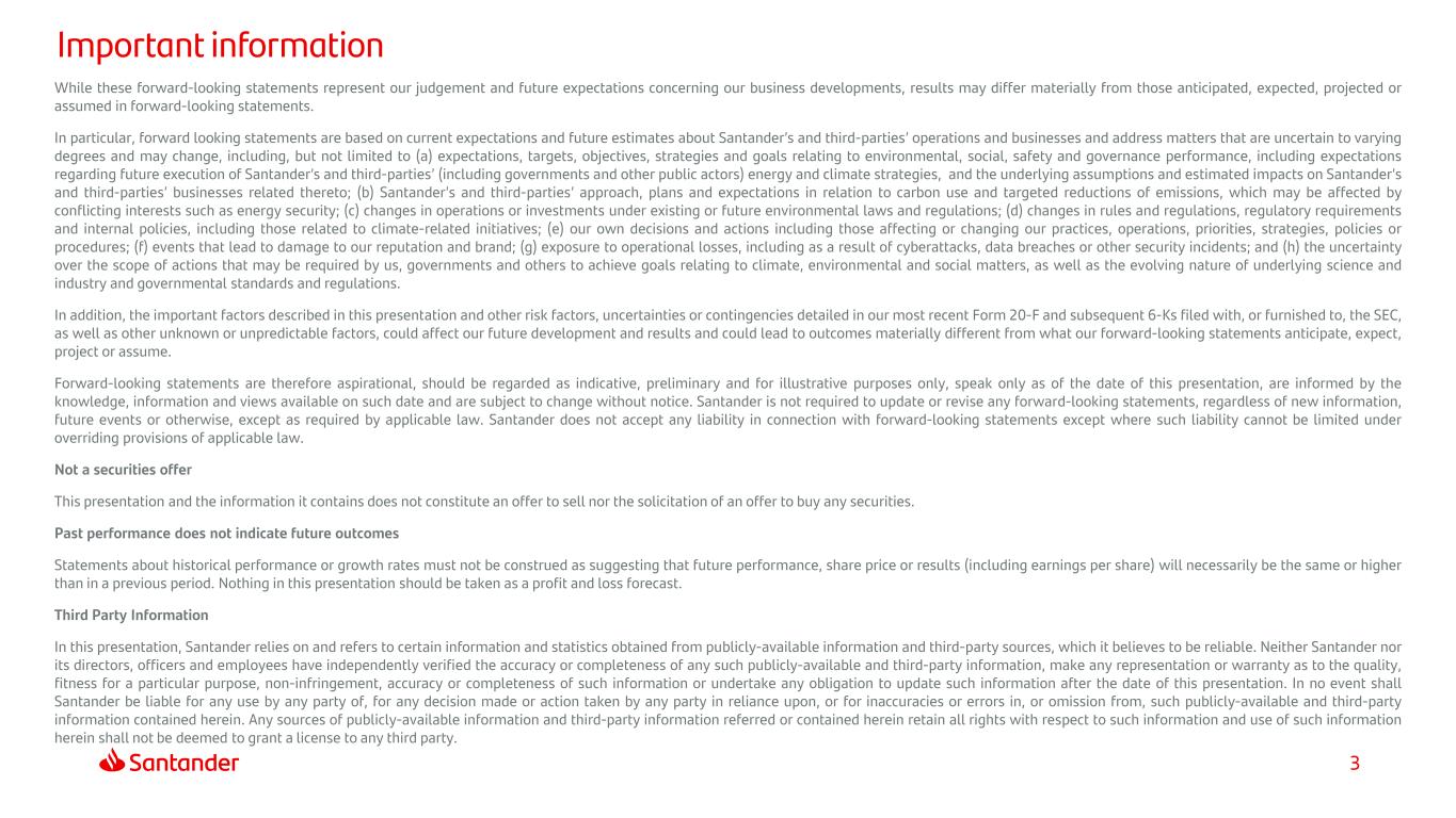 2 Important information Non-IFRS and alternative performance measures This presentation contains financial information prepared according to International Financial Reporting Standards (IFRS) and taken from our consolidated financial statements, as well as alternative performance measures (APMs) as defined in the Guidelines on Alternative Performance Measures issued by the European Securities and Markets Authority (ESMA) on 5 October 2015, and other non-IFRS measures. The APMs and non-IFRS measures were calculated with information from Grupo Santander; however, they are neither defined or detailed in the applicable financial reporting framework nor audited or reviewed by our auditors. We use these APMs and non-IFRS measures when planning, monitoring and evaluating our performance. We consider them to be useful metrics for our management and investors to compare operating performance between periods. APMs we use are presented unless otherwise specified on a constant FX basis, which is computed by adjusting comparative period reported data for the effects of foreign currency translation differences, which distort period-on-period comparisons. Nonetheless, the APMs and non-IFRS measures are supplemental information; their purpose is not to substitute IFRS measures. Furthermore, companies in our industry and others may calculate or use APMs and non-IFRS measures differently, thus making them less useful for comparison purposes. APMs using ESG labels have not been calculated in accordance with the Taxonomy Regulation or with the indicators for principal adverse impact in SFDR. For further details on APMs and Non-IFRS Measures, including their definition or a reconciliation between any applicable management indicators and the financial data presented in the consolidated financial statements prepared under IFRS, please see the 2023 Annual Report on Form 20-F filed with the U.S. Securities and Exchange Commission (the SEC) on 21 February 2024 (https://www.santander.com/content/dam/santander-com/en/documentos/informacion-sobre- resultados-semestrales-y-anuales-suministrada-a-la-sec/2024/sec-2023-annual-20-f-2023-en.pdf), as well as the section “Alternative performance measures” of Banco Santander, S.A. (Santander) Q4 2024 Financial Report, published on 5 February 2025 (https://www.santander.com/en/shareholders-and-investors/financial-and-economic-information#quarterly-results). Underlying measures, which are included in this document, are non-IFRS measures. The businesses included in each of our geographic segments and the accounting principles under which their results are presented here may differ from the businesses included and local applicable accounting principles of our public subsidiaries in such geographies. Accordingly, the results of operations and trends shown for our geographic segments may differ materially from those of such subsidiaries. Non-financial information This presentation contains, in addition to financial information, non-financial information (NFI), including environmental, social and governance-related metrics, statements, goals, commitments and opinions. NFI is not audited nor reviewed by an external auditor. NFI is prepared following various external and internal frameworks, reporting guidelines and measurement, collection and verification methods and practices, which are materially different from those applicable to financial information and are in many cases emerging and evolving. NFI is based on various materiality thresholds, estimates, assumptions, judgments and underlying data derived internally and from third parties. NFI is thus subject to significant measurement uncertainties, may not be comparable to NFI of other companies or over time or across periods and its inclusion is not meant to imply that the information is fit for any particular purpose or that it is material to us under mandatory reporting standards. NFI is for informational purposes only and without any liability being accepted in connection with it except where such liability cannot be limited under overriding provisions of applicable law. Forward-looking statements Santander hereby warns that this presentation contains “forward-looking statements” as per the meaning of the U.S. Private Securities Litigation Reform Act of 1995. Such statements can be understood through words and expressions like “expect”, “project”, “anticipate”, “should”, “intend”, “probability”, “risk”, “VaR”, “RoRAC”, “RoRWA”, “TNAV”, “target”, “goal”, “objective”, “estimate”, “future”, “commitment”, “commit”, “focus”, “pledge” and similar expressions. They include (but are not limited to) statements on future business development, shareholder remuneration policy and NFI.