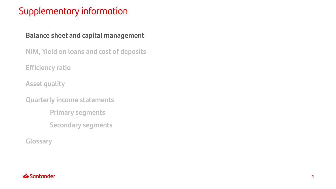 4 Supplementary information Balance sheet and capital management NIM, Yield on loans and cost of deposits Efficiency ratio Asset quality Quarterly income statements Primary segments Secondary segments Glossary