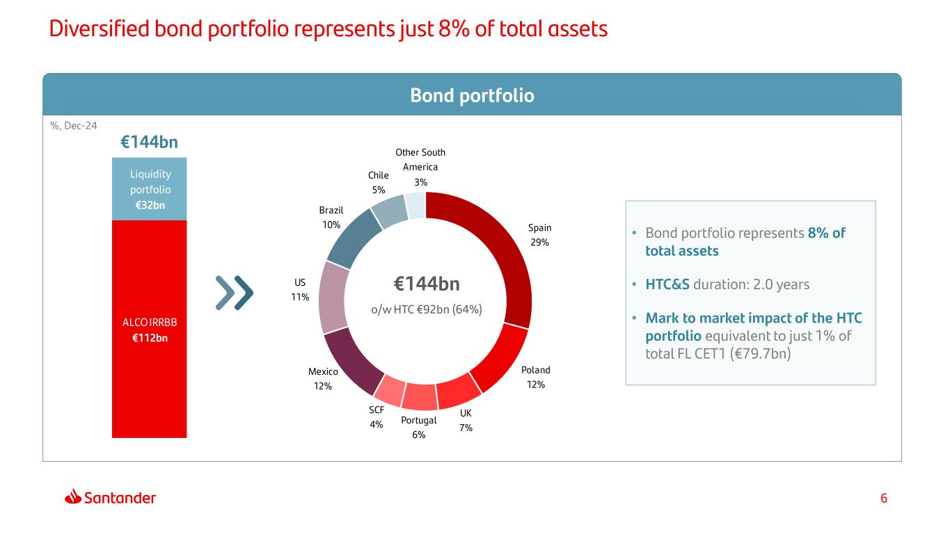 5 Santander’s capital levels, both phased-in and fully loaded, exceed minimum regulatory requirements 4.50% 12.76% >12% 0.98% 2.50% 1.25% CCyB, 0.40% 1.83% 1.66% 1.50% 2.44% 2.73% 2.40% 13.92% 17.15% >15% SyRB, 0.03% Assumed regulatory requirement 2024 Group ratios Dec-24 2024 target ratios Assumed capital requirements (fully-loaded)**SREP capital requirements and MDA* • AT1 and T2 ratios are planned to be close to 1.5% and 2.4% of RWAs respectively CET1 T2 AT1 Dec-24 * The phased-in ratio includes the transitory treatment of IFRS 9, calculated in accordance with article 473 bis of the Capital Requirements Regulation (CRR) and subsequent modifications introduced by Regulation 2020/873 of the European Union. Total phased-in capital ratios include the transitory treatment according to chapter 4, title 1, part 10 of the CRR. ** Fully-loaded CRR and fully-loaded IFRS 9. (1) Estimated countercyclical buffer as of Dec-24. (2) Estimated systemic risk buffer as of Dec-24. (3) MDA trigger = 3.12% - 0.17% = 2.96% (17bps of AT1 shortfall is covered with CET1). Santander Parent Bank has €70.4bn in Available Distributable Items, 108 times the full Parent AT1 budgeted for 2024. 4.50% 12.78% 0.98% 2.50% 1.25% SyRB; 0.03% CCyB; 0.40% 1.83% 1.66% 2.44% 2.95% 13.92% 17.39% Regulatory Requirement 2024 Group ratios Dec-24 • The minimum CET1 to be maintained by the Group is 9.66% • As of Dec-24, the distance to the MDA is 296bps3 and the CET1 management buffer is 312bps CET1 CCoB Pillar 1 AT1 G-SIB buffer2 T2 T2 AT1 Pillar 2 R Dec-24 CCoB Pillar 1 AT1 G-SIB buffer T2 Pillar 2 R 1 +311bps +323bps +294bps +347bps +312bps +296bps 1 2 2