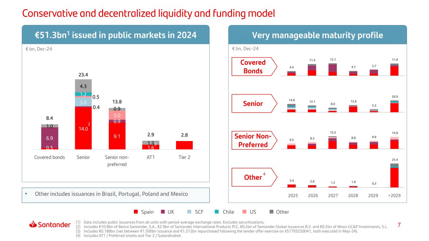 6 Bond portfolio Diversified bond portfolio represents just 8% of total assets %, Dec-24 Spain 29% Poland 12% UK 7% Portugal 6% SCF 4% Mexico 12% US 11% Brazil 10% Chile 5% Other South America 3% €144bn o/w HTC €92bn (64%) • Bond portfolio represents 8% of total assets • HTC&S duration: 2.0 years • Mark to market impact of the HTC portfolio equivalent to just 1% of total FL CET1 (€79.7bn) ALCO IRRBB €112bn Liquidity portfolio €32bn €144bn
