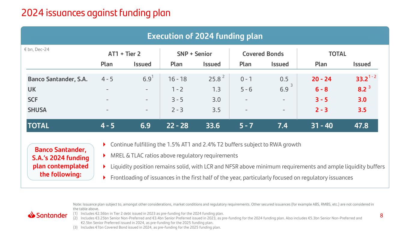 7 Conservative and decentralized liquidity and funding model Very manageable maturity profile€51.3bn1 issued in public markets in 2024 (1) Data includes public issuances from all units with period-average exchange rates. Excludes securitizations. (2) Includes €10.8bn of Banco Santander, S.A., €2.9bn of Santander International Products PLC, €0.2bn of Santander Global Issuances B.V. and €0.2bn of Moon GC&P Investments, S.L. (3) Includes €0.188bn (net between €1.500bn issuance and €1.312bn repurchased following the tender offer exercise on XS1793250041, both executed in May-24). (4) Includes AT1 / Preferred shares and Tier 2 / Subordinated. € bn, Dec-24 0.5 14.0 9.1 1.6 6.9 0.4 0.9 3.0 0.5 3.0 1.2 1.0 4.3 0.9 1.3 8.4 23.4 13.8 2.9 2.8 Covered bonds Senior Senior non- preferred AT1 Tier 2 € bn, Dec-24 Covered Bonds Senior Non- Preferred Senior Other 2025 2026 2027 2028 >2029 4.4 11.4 12.1 4.7 5.7 11.9 6.5 8.3 15.5 8.8 9.9 14.9 14.8 12.1 8.0 12.6 5.3 20.9 3.4 2.6 1.2 1.9 0.3 25.4 2029• Other includes issuances in Brazil, Portugal, Poland and Mexico Spain UK SCF Chile US Other 4 2 3