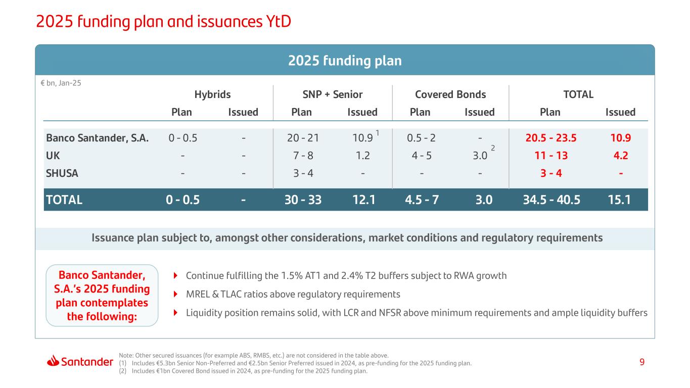 8 2024 issuances against funding plan Execution of 2024 funding plan € bn, Dec-24 Note: Issuance plan subject to, amongst other considerations, market conditions and regulatory requirements. Other secured issuances (for example ABS, RMBS, etc.) are not considered in the table above. (1) Includes €2.56bn in Tier 2 debt issued in 2023 as pre-funding for the 2024 funding plan. (2) Includes €3.25bn Senior Non-Preferred and €3.4bn Senior Preferred issued in 2023, as pre-funding for the 2024 funding plan. Also includes €5.3bn Senior Non-Preferred and €2.5bn Senior Preferred issued in 2024, as pre-funding for the 2025 funding plan. (3) Includes €1bn Covered Bond issued in 2024, as pre-funding for the 2025 funding plan. Continue fulfilling the 1.5% AT1 and 2.4% T2 buffers subject to RWA growth MREL & TLAC ratios above regulatory requirements Liquidity position remains solid, with LCR and NFSR above minimum requirements and ample liquidity buffers Frontloading of issuances in the first half of the year, particularly focused on regulatory issuances Banco Santander, S.A.’s 2024 funding plan contemplated the following: Plan Issued Plan Issued Plan Issued Plan Issued Banco Santander, S.A. 4 - 5 6.9 16 - 18 25.8 0 - 1 0.5 20 - 24 33.2 UK - - 1 - 2 1.3 5 - 6 6.9 6 - 8 8.2 SCF - - 3 - 5 3.0 - - 3 - 5 3.0 SHUSA - - 2 - 3 3.5 - - 2 - 3 3.5 TOTAL 4 - 5 6.9 22 - 28 33.6 5 - 7 7.4 31 - 40 47.8 AT1 + Tier 2 SNP + Senior Covered Bonds TOTAL 21 3 1 - 2 3
