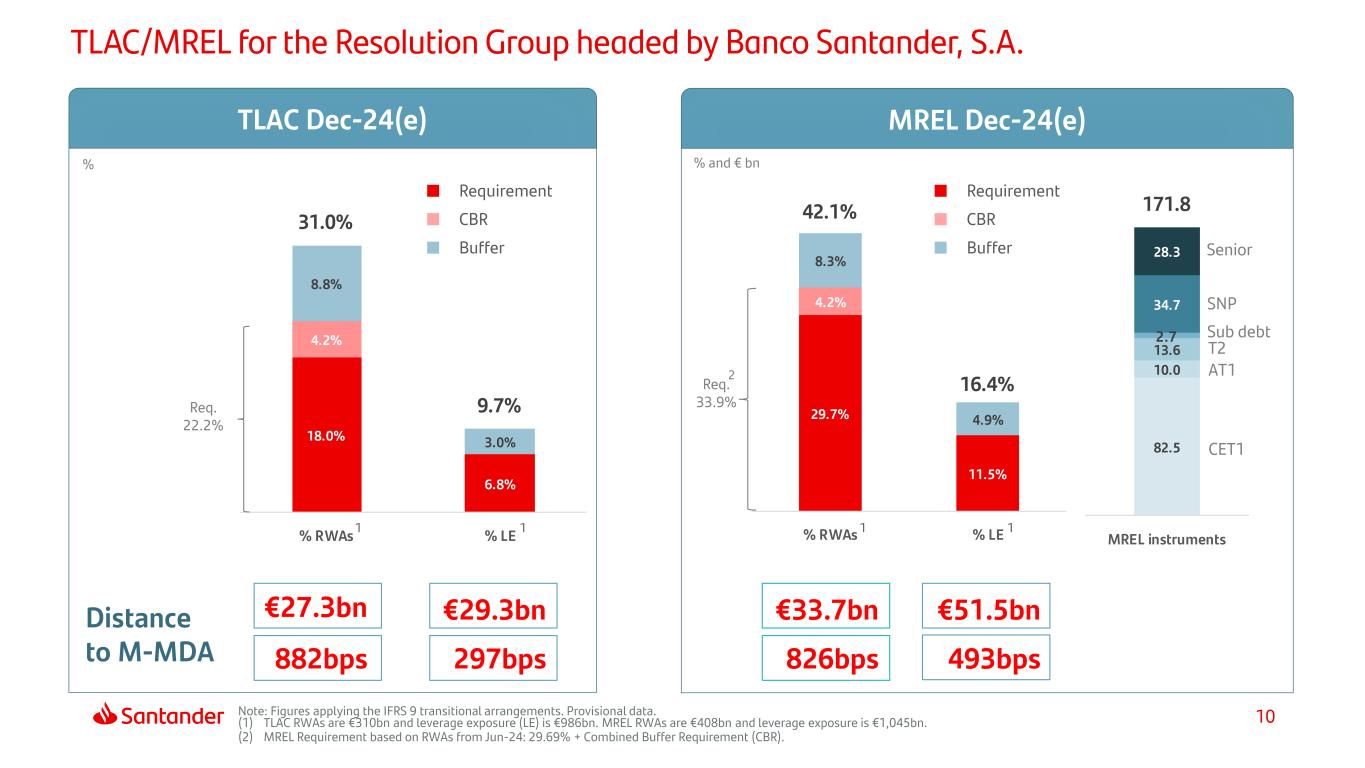 9 Plan Issued Plan Issued Plan Issued Plan Issued Banco Santander, S.A. 0 - 0.5 - 20 - 21 10.9 0.5 - 2 - 20.5 - 23.5 10.9 UK - - 7 - 8 1.2 4 - 5 3.0 11 - 13 4.2 SHUSA - - 3 - 4 - - - 3 - 4 - TOTAL 0 - 0.5 - 30 - 33 12.1 4.5 - 7 3.0 34.5 - 40.5 15.1 Hybrids SNP + Senior Covered Bonds TOTAL 2025 funding plan and issuances YtD Issuance plan subject to, amongst other considerations, market conditions and regulatory requirements 2025 funding plan Continue fulfilling the 1.5% AT1 and 2.4% T2 buffers subject to RWA growth MREL & TLAC ratios above regulatory requirements Liquidity position remains solid, with LCR and NFSR above minimum requirements and ample liquidity buffers Banco Santander, S.A.’s 2025 funding plan contemplates the following: Note: Other secured issuances (for example ABS, RMBS, etc.) are not considered in the table above. (1) Includes €5.3bn Senior Non-Preferred and €2.5bn Senior Preferred issued in 2024, as pre-funding for the 2025 funding plan. (2) Includes €1bn Covered Bond issued in 2024, as pre-funding for the 2025 funding plan. 2 1 € bn, Jan-25