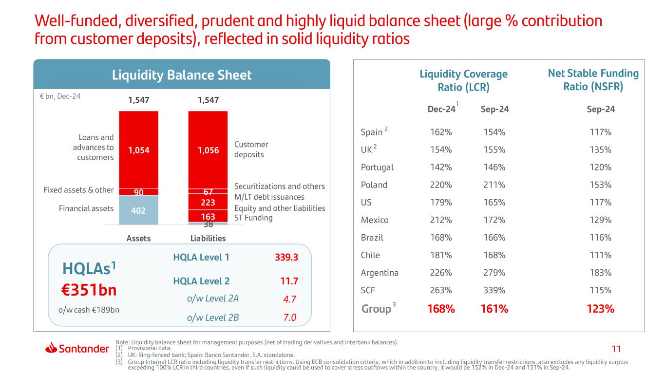 10 TLAC/MREL for the Resolution Group headed by Banco Santander, S.A. 29.7% 11.5% 4.2% 8.3% 4.9% 42.1% 16.4% % RWAs % LE 18.0% 6.8% 4.2% 8.8% 3.0% 31.0% 9.7% % RWAs % LE MREL Dec-24(e)TLAC Dec-24(e) % and € bn Req. 33.9% Requirement CBR Buffer SNP T2 CET1 Senior AT1 Sub debt % Req. 22.2% Distance to M-MDA €27.3bn 882bps €29.3bn 297bps €33.7bn 826bps €51.5bn 493bps 82.5 10.0 13.6 2.7 34.7 28.3 171.8 MREL instruments 1 1 1 1 2 Requirement CBR Buffer Note: Figures applying the IFRS 9 transitional arrangements. Provisional data. (1) TLAC RWAs are €310bn and leverage exposure (LE) is €986bn. MREL RWAs are €408bn and leverage exposure is €1,045bn. (2) MREL Requirement based on RWAs from Jun-24: 29.69% + Combined Buffer Requirement (CBR).