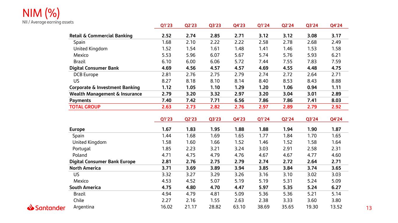 13 NIM (%) NII / Average earning assets Q1'23 Q2'23 Q3'23 Q4'23 Q1'24 Q2'24 Q3'24 Q4'24 Retail & Commercial Banking 2.52 2.74 2.85 2.71 3.12 3.12 3.08 3.17 Spain 1.68 2.10 2.22 2.22 2.58 2.78 2.68 2.49 United Kingdom 1.52 1.54 1.61 1.48 1.41 1.46 1.53 1.58 Mexico 5.53 5.96 6.07 5.67 5.74 5.76 5.93 6.21 Brazil 6.10 6.00 6.06 5.72 7.44 7.55 7.83 7.59 Digital Consumer Bank 4.69 4.56 4.57 4.57 4.69 4.55 4.48 4.75 DCB Europe 2.81 2.76 2.75 2.79 2.74 2.72 2.64 2.71 US 8.27 8.18 8.10 8.14 8.40 8.53 8.43 8.88 Corporate & Investment Banking 1.12 1.05 1.10 1.29 1.20 1.06 0.94 1.11 Wealth Management & Insurance 2.79 3.20 3.32 2.97 3.20 3.04 3.01 2.89 Payments 7.40 7.42 7.71 6.56 7.86 7.86 7.41 8.03 TOTAL GROUP 2.63 2.73 2.82 2.76 2.97 2.89 2.79 2.92 Q1'23 Q2'23 Q3'23 Q4'23 Q1'24 Q2'24 Q3'24 Q4'24 Europe 1.67 1.83 1.95 1.88 1.88 1.94 1.90 1.87 Spain 1.44 1.68 1.69 1.65 1.77 1.84 1.70 1.65 United Kingdom 1.58 1.60 1.66 1.52 1.46 1.52 1.58 1.64 Portugal 1.85 2.23 3.21 3.24 3.03 2.91 2.58 2.31 Poland 4.71 4.75 4.79 4.76 4.67 4.67 4.77 4.60 Digital Consumer Bank Europe 2.81 2.76 2.75 2.79 2.74 2.72 2.64 2.71 North America 3.71 3.69 3.89 3.94 3.85 3.84 3.74 3.65 US 3.32 3.27 3.29 3.26 3.16 3.10 3.02 3.03 Mexico 4.53 4.52 5.07 5.19 5.19 5.31 5.24 5.09 South America 4.75 4.80 4.70 4.47 5.97 5.35 5.24 6.27 Brazil 4.94 4.79 4.81 5.09 5.36 5.36 5.21 5.14 Chile 2.27 2.16 1.55 2.63 2.38 3.33 3.60 3.80 Argentina 16.02 21.17 28.82 63.10 38.69 35.65 19.30 13.52