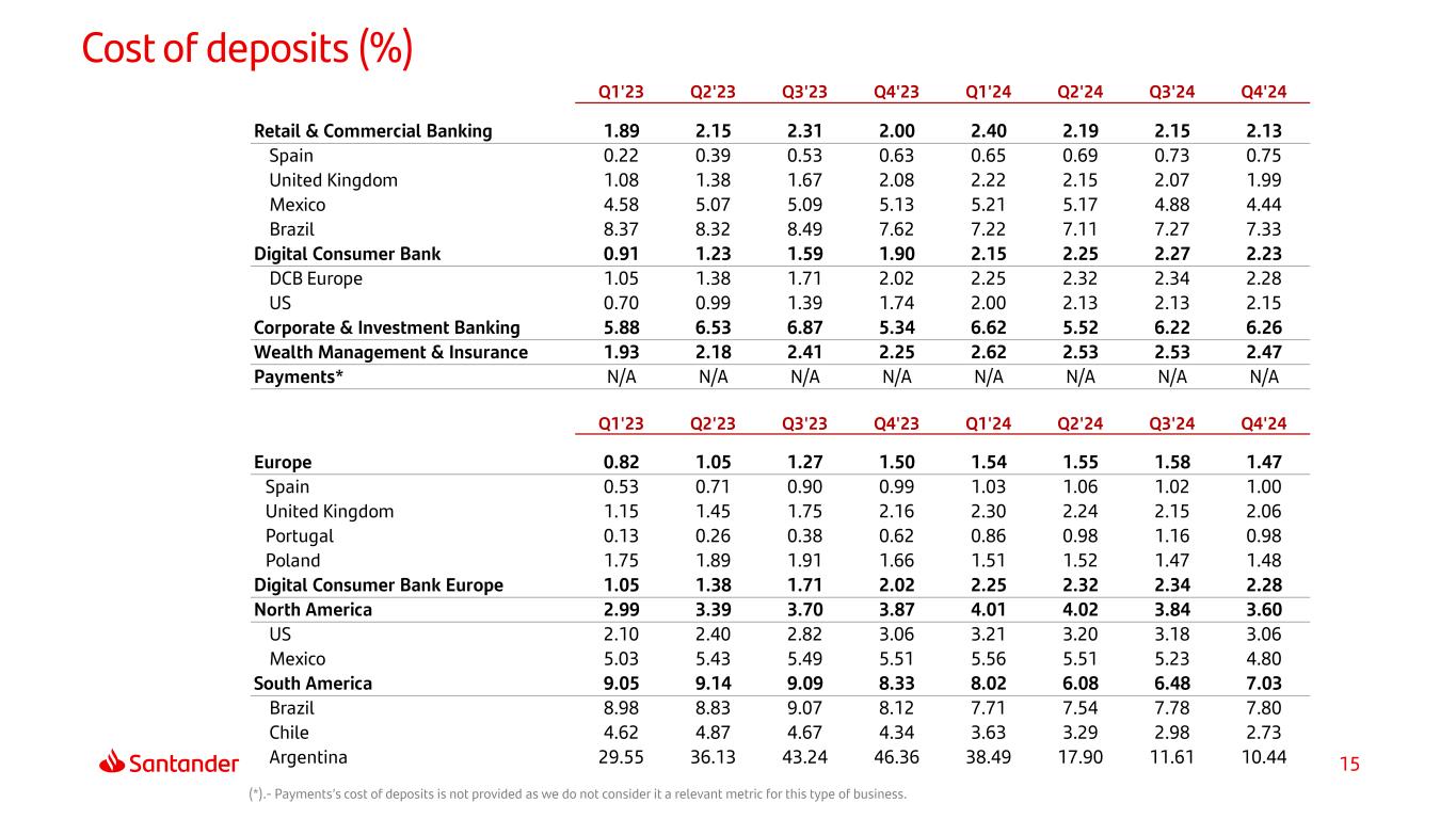 15 Cost of deposits (%) (*).- Payments’s cost of deposits is not provided as we do not consider it a relevant metric for this type of business. Q1'23 Q2'23 Q3'23 Q4'23 Q1'24 Q2'24 Q3'24 Q4'24 Retail & Commercial Banking 1.89 2.15 2.31 2.00 2.40 2.19 2.15 2.13 Spain 0.22 0.39 0.53 0.63 0.65 0.69 0.73 0.75 United Kingdom 1.08 1.38 1.67 2.08 2.22 2.15 2.07 1.99 Mexico 4.58 5.07 5.09 5.13 5.21 5.17 4.88 4.44 Brazil 8.37 8.32 8.49 7.62 7.22 7.11 7.27 7.33 Digital Consumer Bank 0.91 1.23 1.59 1.90 2.15 2.25 2.27 2.23 DCB Europe 1.05 1.38 1.71 2.02 2.25 2.32 2.34 2.28 US 0.70 0.99 1.39 1.74 2.00 2.13 2.13 2.15 Corporate & Investment Banking 5.88 6.53 6.87 5.34 6.62 5.52 6.22 6.26 Wealth Management & Insurance 1.93 2.18 2.41 2.25 2.62 2.53 2.53 2.47 Payments* N/A N/A N/A N/A N/A N/A N/A N/A Q1'23 Q2'23 Q3'23 Q4'23 Q1'24 Q2'24 Q3'24 Q4'24 Europe 0.82 1.05 1.27 1.50 1.54 1.55 1.58 1.47 Spain 0.53 0.71 0.90 0.99 1.03 1.06 1.02 1.00 United Kingdom 1.15 1.45 1.75 2.16 2.30 2.24 2.15 2.06 Portugal 0.13 0.26 0.38 0.62 0.86 0.98 1.16 0.98 Poland 1.75 1.89 1.91 1.66 1.51 1.52 1.47 1.48 Digital Consumer Bank Europe 1.05 1.38 1.71 2.02 2.25 2.32 2.34 2.28 North America 2.99 3.39 3.70 3.87 4.01 4.02 3.84 3.60 US 2.10 2.40 2.82 3.06 3.21 3.20 3.18 3.06 Mexico 5.03 5.43 5.49 5.51 5.56 5.51 5.23 4.80 South America 9.05 9.14 9.09 8.33 8.02 6.08 6.48 7.03 Brazil 8.98 8.83 9.07 8.12 7.71 7.54 7.78 7.80 Chile 4.62 4.87 4.67 4.34 3.63 3.29 2.98 2.73 Argentina 29.55 36.13 43.24 46.36 38.49 17.90 11.61 10.44