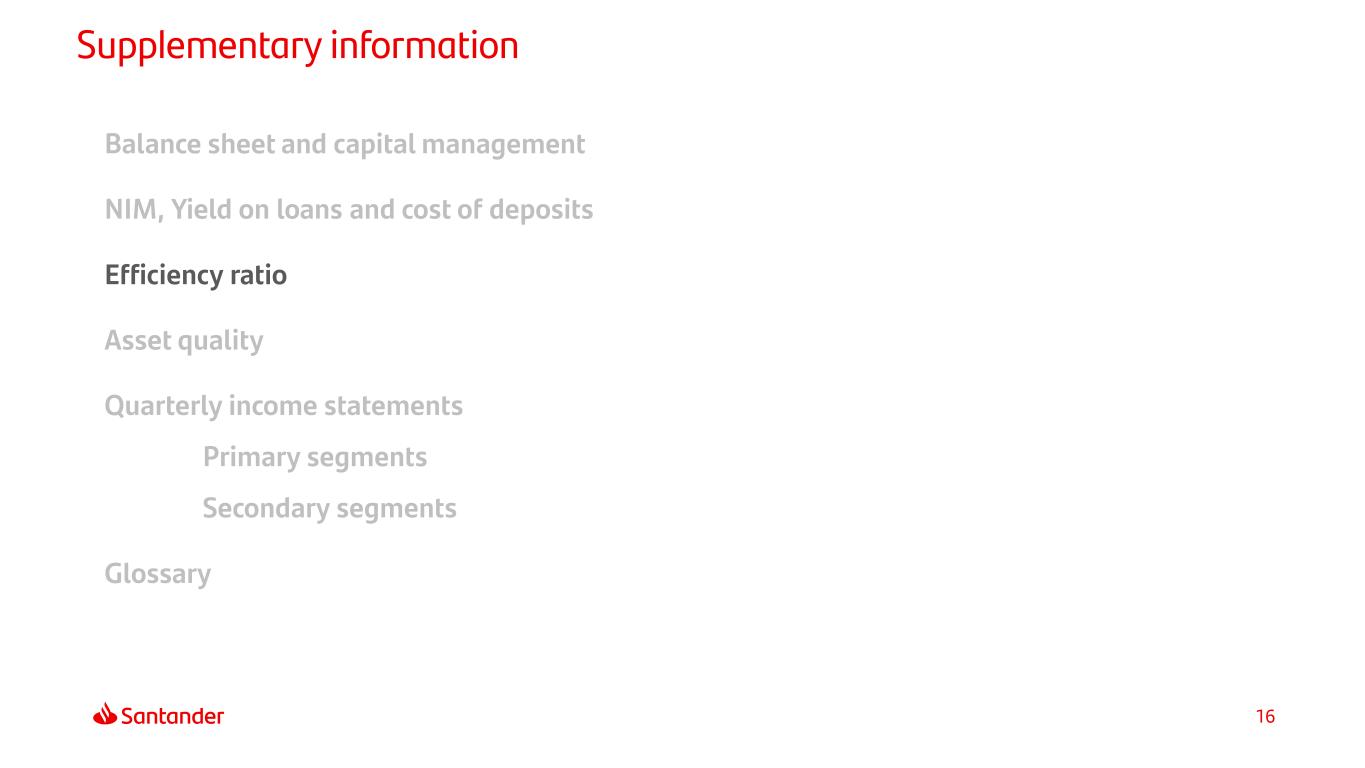 16 Supplementary information Balance sheet and capital management NIM, Yield on loans and cost of deposits Efficiency ratio Asset quality Quarterly income statements Primary segments Secondary segments Glossary