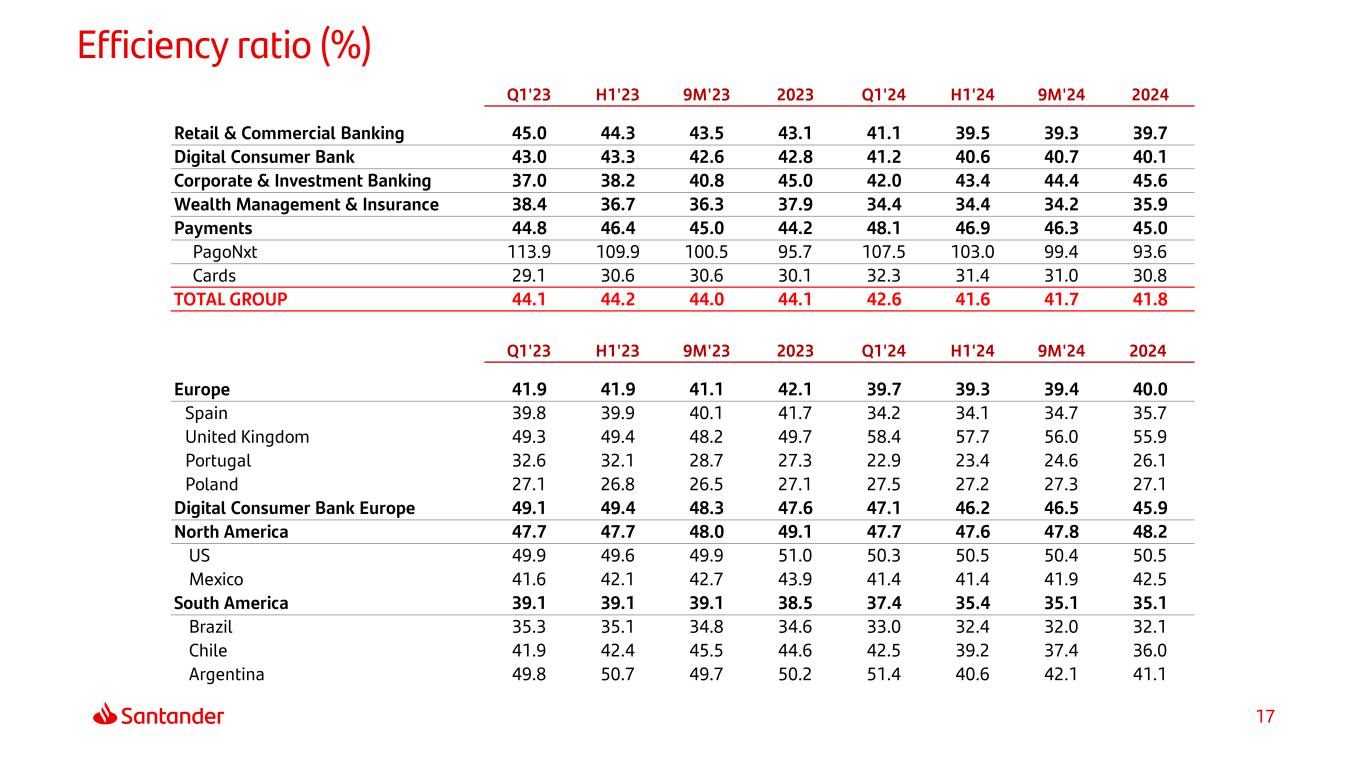 17 Efficiency ratio (%) Q1'23 H1'23 9M'23 2023 Q1'24 H1'24 9M'24 2024 Retail & Commercial Banking 45.0 44.3 43.5 43.1 41.1 39.5 39.3 39.7 Digital Consumer Bank 43.0 43.3 42.6 42.8 41.2 40.6 40.7 40.1 Corporate & Investment Banking 37.0 38.2 40.8 45.0 42.0 43.4 44.4 45.6 Wealth Management & Insurance 38.4 36.7 36.3 37.9 34.4 34.4 34.2 35.9 Payments 44.8 46.4 45.0 44.2 48.1 46.9 46.3 45.0 PagoNxt 113.9 109.9 100.5 95.7 107.5 103.0 99.4 93.6 Cards 29.1 30.6 30.6 30.1 32.3 31.4 31.0 30.8 TOTAL GROUP 44.1 44.2 44.0 44.1 42.6 41.6 41.7 41.8 Q1'23 H1'23 9M'23 2023 Q1'24 H1'24 9M'24 2024 Europe 41.9 41.9 41.1 42.1 39.7 39.3 39.4 40.0 Spain 39.8 39.9 40.1 41.7 34.2 34.1 34.7 35.7 United Kingdom 49.3 49.4 48.2 49.7 58.4 57.7 56.0 55.9 Portugal 32.6 32.1 28.7 27.3 22.9 23.4 24.6 26.1 Poland 27.1 26.8 26.5 27.1 27.5 27.2 27.3 27.1 Digital Consumer Bank Europe 49.1 49.4 48.3 47.6 47.1 46.2 46.5 45.9 North America 47.7 47.7 48.0 49.1 47.7 47.6 47.8 48.2 US 49.9 49.6 49.9 51.0 50.3 50.5 50.4 50.5 Mexico 41.6 42.1 42.7 43.9 41.4 41.4 41.9 42.5 South America 39.1 39.1 39.1 38.5 37.4 35.4 35.1 35.1 Brazil 35.3 35.1 34.8 34.6 33.0 32.4 32.0 32.1 Chile 41.9 42.4 45.5 44.6 42.5 39.2 37.4 36.0 Argentina 49.8 50.7 49.7 50.2 51.4 40.6 42.1 41.1