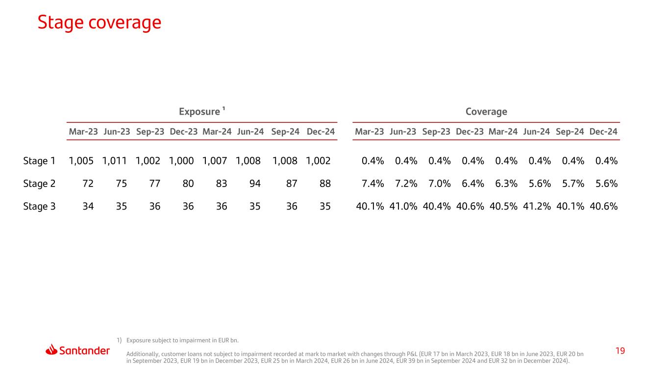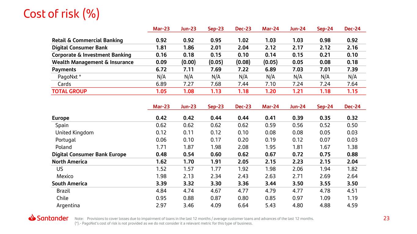 23 Cost of risk (%) Note: Provisions to cover losses due to impairment of loans in the last 12 months / average customer loans and advances of the last 12 months. (*).- PagoNxt’s cost of risk is not provided as we do not consider it a relevant metric for this type of business. Mar-23 Jun-23 Sep-23 Dec-23 Mar-24 Jun-24 Sep-24 Dec-24 Retail & Commercial Banking 0.92 0.92 0.95 1.02 1.03 1.03 0.98 0.92 Digital Consumer Bank 1.81 1.86 2.01 2.04 2.12 2.17 2.12 2.16 Corporate & Investment Banking 0.16 0.18 0.15 0.10 0.14 0.15 0.21 0.10 Wealth Management & Insurance 0.09 (0.00) (0.05) (0.08) (0.05) 0.05 0.08 0.18 Payments 6.72 7.11 7.69 7.22 6.89 7.03 7.01 7.39 PagoNxt * N/A N/A N/A N/A N/A N/A N/A N/A Cards 6.89 7.27 7.68 7.44 7.10 7.24 7.24 7.64 TOTAL GROUP 1.05 1.08 1.13 1.18 1.20 1.21 1.18 1.15 Mar-23 Jun-23 Sep-23 Dec-23 Mar-24 Jun-24 Sep-24 Dec-24 Europe 0.42 0.42 0.44 0.44 0.41 0.39 0.35 0.32 Spain 0.62 0.62 0.62 0.62 0.59 0.56 0.52 0.50 United Kingdom 0.12 0.11 0.12 0.10 0.08 0.08 0.05 0.03 Portugal 0.06 0.10 0.17 0.20 0.19 0.12 0.07 0.03 Poland 1.71 1.87 1.98 2.08 1.95 1.81 1.67 1.38 Digital Consumer Bank Europe 0.48 0.54 0.60 0.62 0.67 0.72 0.75 0.88 North America 1.62 1.70 1.91 2.05 2.15 2.23 2.15 2.04 US 1.52 1.57 1.77 1.92 1.98 2.06 1.94 1.82 Mexico 1.98 2.13 2.34 2.43 2.63 2.71 2.69 2.64 South America 3.39 3.32 3.30 3.36 3.44 3.50 3.55 3.50 Brazil 4.84 4.74 4.67 4.77 4.79 4.77 4.78 4.51 Chile 0.95 0.88 0.87 0.80 0.85 0.97 1.09 1.19 Argentina 2.97 3.46 4.09 6.64 5.43 4.80 4.88 4.59
