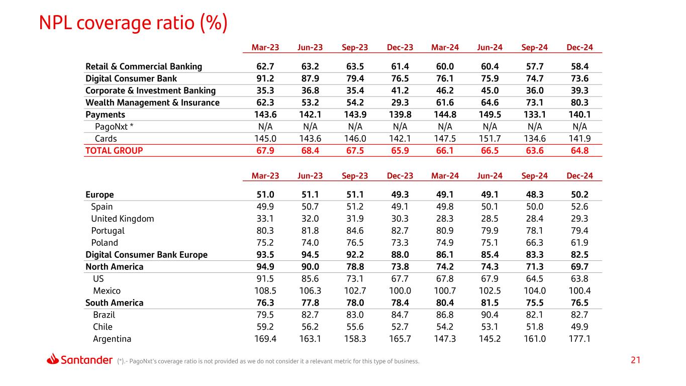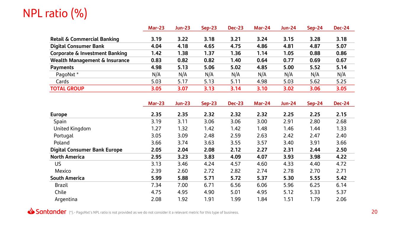 20 NPL ratio (%) Mar-23 Jun-23 Sep-23 Dec-23 Mar-24 Jun-24 Sep-24 Dec-24 Retail & Commercial Banking 3.19 3.22 3.18 3.21 3.24 3.15 3.28 3.18 Digital Consumer Bank 4.04 4.18 4.65 4.75 4.86 4.81 4.87 5.07 Corporate & Investment Banking 1.42 1.38 1.37 1.36 1.14 1.05 0.88 0.86 Wealth Management & Insurance 0.83 0.82 0.82 1.40 0.64 0.77 0.69 0.67 Payments 4.98 5.13 5.06 5.02 4.85 5.00 5.52 5.14 PagoNxt * N/A N/A N/A N/A N/A N/A N/A N/A Cards 5.03 5.17 5.13 5.11 4.98 5.03 5.62 5.25 TOTAL GROUP 3.05 3.07 3.13 3.14 3.10 3.02 3.06 3.05 Mar-23 Jun-23 Sep-23 Dec-23 Mar-24 Jun-24 Sep-24 Dec-24 Europe 2.35 2.35 2.32 2.32 2.32 2.25 2.25 2.15 Spain 3.19 3.11 3.06 3.06 3.00 2.91 2.80 2.68 United Kingdom 1.27 1.32 1.42 1.42 1.48 1.46 1.44 1.33 Portugal 3.05 3.09 2.48 2.59 2.63 2.42 2.47 2.40 Poland 3.66 3.74 3.63 3.55 3.57 3.40 3.91 3.66 Digital Consumer Bank Europe 2.05 2.04 2.08 2.12 2.27 2.31 2.44 2.50 North America 2.95 3.23 3.83 4.09 4.07 3.93 3.98 4.22 US 3.13 3.46 4.24 4.57 4.60 4.33 4.40 4.72 Mexico 2.39 2.60 2.72 2.82 2.74 2.78 2.70 2.71 South America 5.99 5.88 5.71 5.72 5.37 5.30 5.55 5.42 Brazil 7.34 7.00 6.71 6.56 6.06 5.96 6.25 6.14 Chile 4.75 4.95 4.90 5.01 4.95 5.12 5.33 5.37 Argentina 2.08 1.92 1.91 1.99 1.84 1.51 1.79 2.06 (*).- PagoNxt's NPL ratio is not provided as we do not consider it a relevant metric for this type of business.