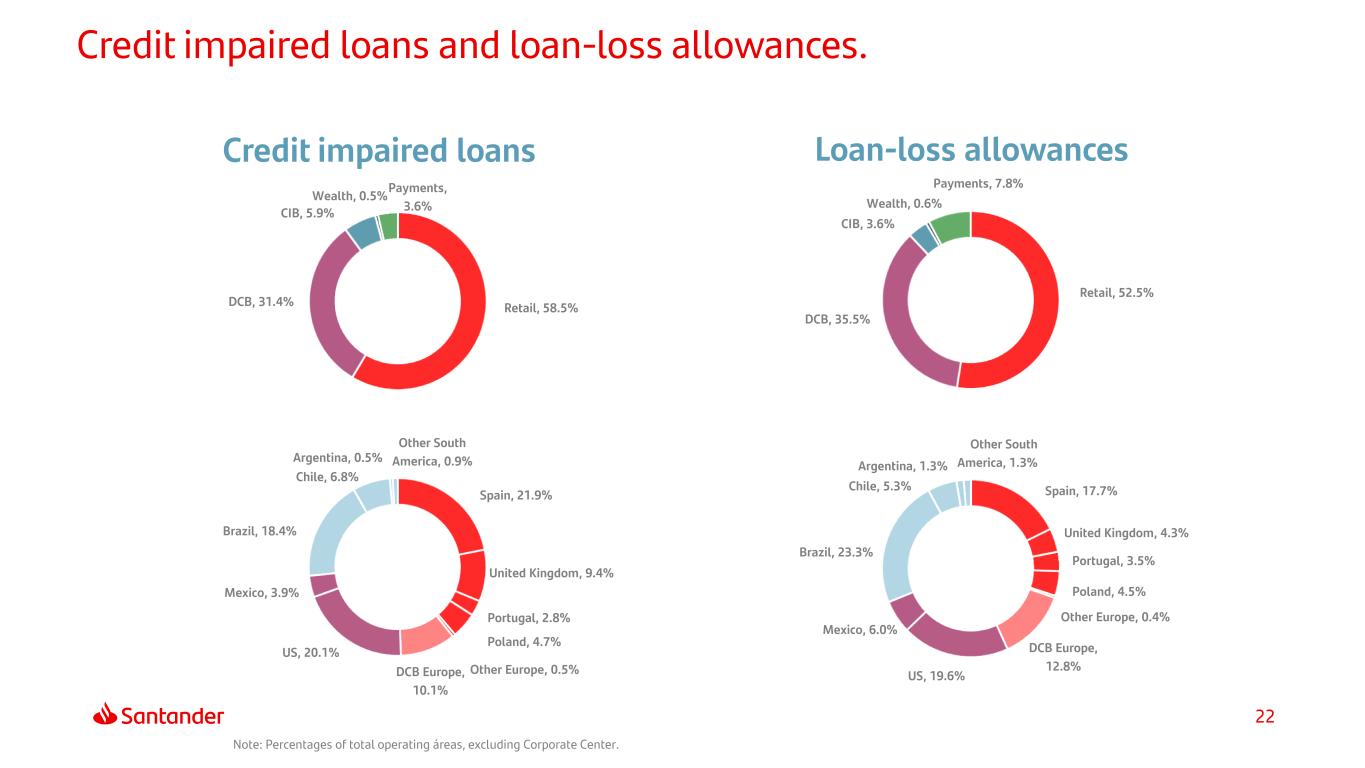 22 Loan-loss allowancesCredit impaired loans Credit impaired loans and loan-loss allowances. Retail, 58.5%DCB, 31.4% CIB, 5.9% Wealth, 0.5% Payments, 3.6% Retail, 52.5% DCB, 35.5% CIB, 3.6% Wealth, 0.6% Payments, 7.8% Spain, 17.7% United Kingdom, 4.3% Portugal, 3.5% Poland, 4.5% Other Europe, 0.4% DCB Europe, 12.8% US, 19.6% Mexico, 6.0% Brazil, 23.3% Chile, 5.3% Argentina, 1.3% Other South America, 1.3% Spain, 21.9% United Kingdom, 9.4% Portugal, 2.8% Poland, 4.7% Other Europe, 0.5%DCB Europe, 10.1% US, 20.1% Mexico, 3.9% Brazil, 18.4% Chile, 6.8% Argentina, 0.5% Other South America, 0.9% Note: Percentages of total operating áreas, excluding Corporate Center.