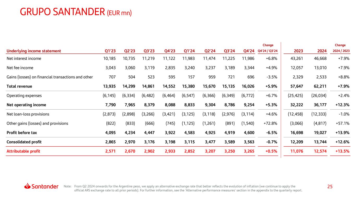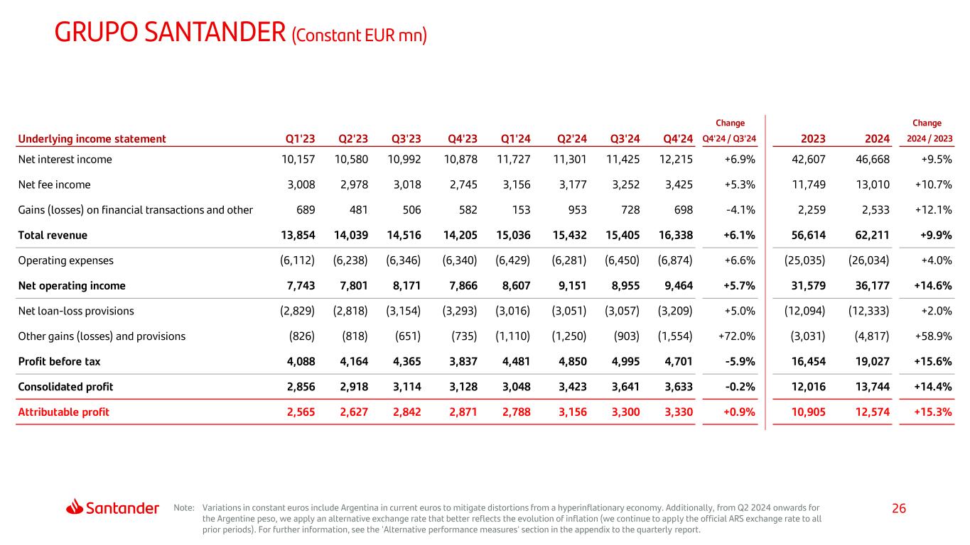 25 GRUPO SANTANDER (EUR mn) Change Change Underlying income statement Q1'23 Q2'23 Q3'23 Q4'23 Q1'24 Q2'24 Q3'24 Q4'24 Q4'24 / Q3'24 2023 2024 2024 / 2023 Net interest income 10,185 10,735 11,219 11,122 11,983 11,474 11,225 11,986 +6.8% 43,261 46,668 +7.9% Net fee income 3,043 3,060 3,119 2,835 3,240 3,237 3,189 3,344 +4.9% 12,057 13,010 +7.9% Gains (losses) on financial transactions and other 707 504 523 595 157 959 721 696 -3.5% 2,329 2,533 +8.8% Total revenue 13,935 14,299 14,861 14,552 15,380 15,670 15,135 16,026 +5.9% 57,647 62,211 +7.9% Operating expenses (6,145) (6,334) (6,482) (6,464) (6,547) (6,366) (6,349) (6,772) +6.7% (25,425) (26,034) +2.4% Net operating income 7,790 7,965 8,379 8,088 8,833 9,304 8,786 9,254 +5.3% 32,222 36,177 +12.3% Net loan-loss provisions (2,873) (2,898) (3,266) (3,421) (3,125) (3,118) (2,976) (3,114) +4.6% (12,458) (12,333) -1.0% Other gains (losses) and provisions (822) (833) (666) (745) (1,125) (1,261) (891) (1,540) +72.8% (3,066) (4,817) +57.1% Profit before tax 4,095 4,234 4,447 3,922 4,583 4,925 4,919 4,600 -6.5% 16,698 19,027 +13.9% Consolidated profit 2,865 2,970 3,176 3,198 3,115 3,477 3,589 3,563 -0.7% 12,209 13,744 +12.6% Attributable profit 2,571 2,670 2,902 2,933 2,852 3,207 3,250 3,265 +0.5% 11,076 12,574 +13.5% Note: From Q2 2024 onwards for the Argentine peso, we apply an alternative exchange rate that better reflects the evolution of inflation (we continue to apply the official ARS exchange rate to all prior periods). For further information, see the 'Alternative performance measures' section in the appendix to the quarterly report.