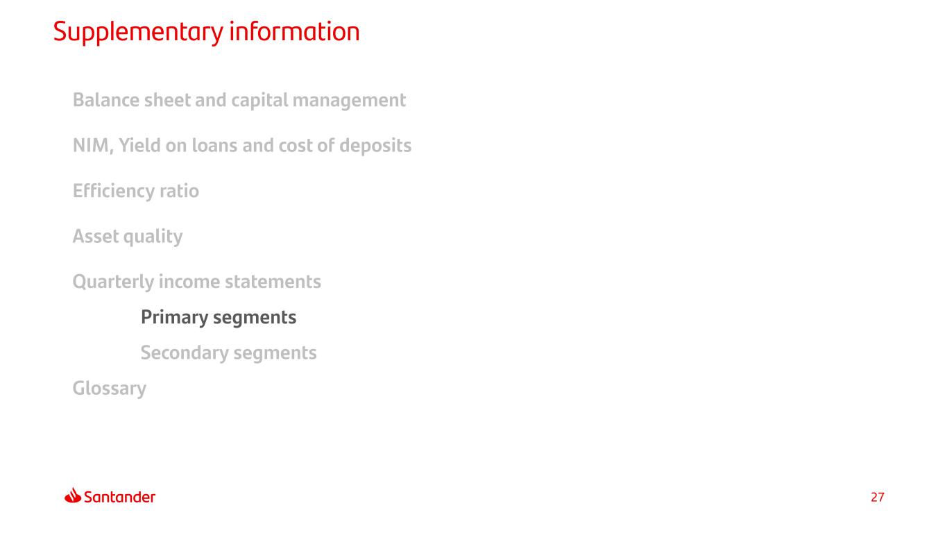 27 Supplementary information Balance sheet and capital management NIM, Yield on loans and cost of deposits Efficiency ratio Asset quality Quarterly income statements Primary segments Secondary segments Glossary