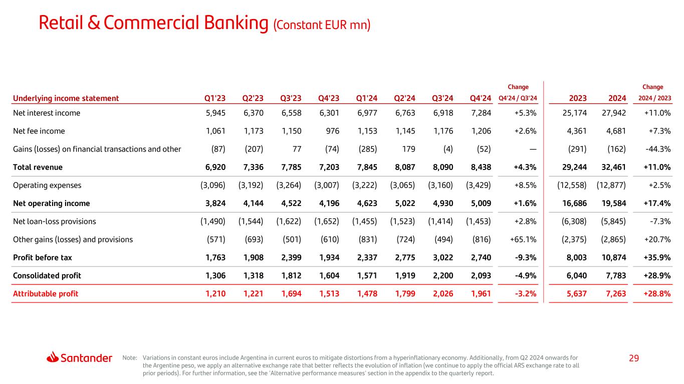 28 Retail & Commercial Banking (EUR mn) Change Change Underlying income statement Q1'23 Q2'23 Q3'23 Q4'23 Q1'24 Q2'24 Q3'24 Q4'24 Q4'24 / Q3'24 2023 2024 2024 / 2023 Net interest income 5,931 6,470 6,705 6,445 7,145 6,870 6,803 7,125 +4.7% 25,550 27,942 +9.4% Net fee income 1,074 1,212 1,196 1,015 1,193 1,173 1,149 1,166 +1.5% 4,497 4,681 +4.1% Gains (losses) on financial transactions and other (85) (209) 74 (72) (289) 183 (6) (49) +663.7% (293) (162) -44.7% Total revenue 6,919 7,473 7,975 7,388 8,048 8,226 7,945 8,242 +3.7% 29,754 32,461 +9.1% Operating expenses (3,111) (3,263) (3,361) (3,089) (3,304) (3,119) (3,102) (3,352) +8.1% (12,825) (12,877) +0.4% Net operating income 3,809 4,209 4,613 4,298 4,744 5,107 4,844 4,890 +1.0% 16,930 19,584 +15.7% Net loan-loss provisions (1,512) (1,599) (1,698) (1,730) (1,523) (1,564) (1,369) (1,388) +1.4% (6,540) (5,845) -10.6% Other gains (losses) and provisions (566) (702) (513) (619) (844) (733) (484) (804) +66.0% (2,401) (2,865) +19.4% Profit before tax 1,731 1,908 2,402 1,949 2,376 2,810 2,990 2,697 -9.8% 7,989 10,874 +36.1% Consolidated profit 1,290 1,325 1,820 1,627 1,597 1,945 2,179 2,062 -5.4% 6,062 7,783 +28.4% Attributable profit 1,196 1,226 1,706 1,532 1,503 1,824 2,005 1,932 -3.7% 5,659 7,263 +28.3% Note: From Q2 2024 onwards for the Argentine peso, we apply an alternative exchange rate that better reflects the evolution of inflation (we continue to apply the official ARS exchange rate to all prior periods). For further information, see the 'Alternative performance measures' section in the appendix to the quarterly report.