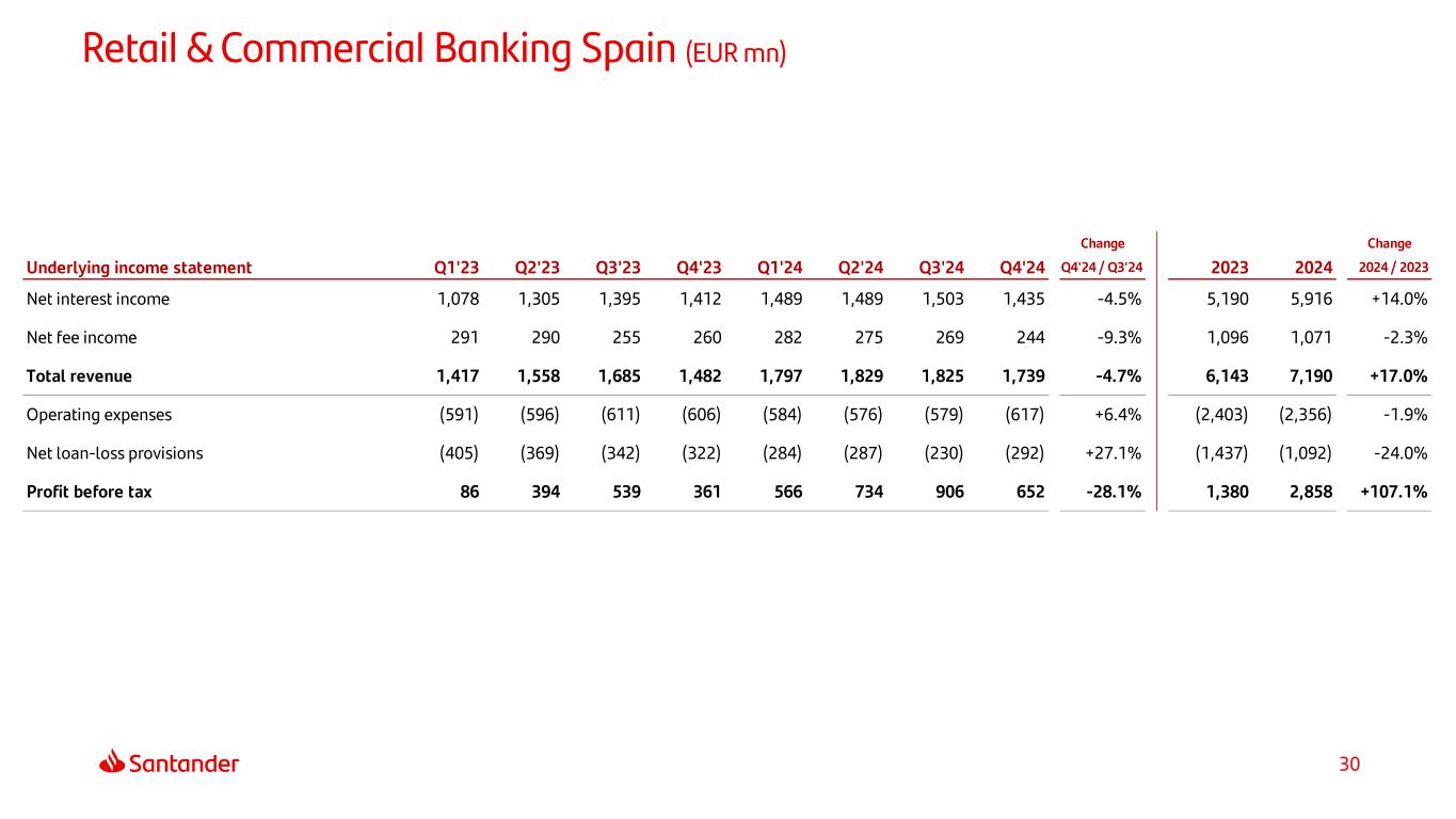 29 Retail & Commercial Banking (Constant EUR mn) Change Change Underlying income statement Q1'23 Q2'23 Q3'23 Q4'23 Q1'24 Q2'24 Q3'24 Q4'24 Q4'24 / Q3'24 2023 2024 2024 / 2023 Net interest income 5,945 6,370 6,558 6,301 6,977 6,763 6,918 7,284 +5.3% 25,174 27,942 +11.0% Net fee income 1,061 1,173 1,150 976 1,153 1,145 1,176 1,206 +2.6% 4,361 4,681 +7.3% Gains (losses) on financial transactions and other (87) (207) 77 (74) (285) 179 (4) (52) — (291) (162) -44.3% Total revenue 6,920 7,336 7,785 7,203 7,845 8,087 8,090 8,438 +4.3% 29,244 32,461 +11.0% Operating expenses (3,096) (3,192) (3,264) (3,007) (3,222) (3,065) (3,160) (3,429) +8.5% (12,558) (12,877) +2.5% Net operating income 3,824 4,144 4,522 4,196 4,623 5,022 4,930 5,009 +1.6% 16,686 19,584 +17.4% Net loan-loss provisions (1,490) (1,544) (1,622) (1,652) (1,455) (1,523) (1,414) (1,453) +2.8% (6,308) (5,845) -7.3% Other gains (losses) and provisions (571) (693) (501) (610) (831) (724) (494) (816) +65.1% (2,375) (2,865) +20.7% Profit before tax 1,763 1,908 2,399 1,934 2,337 2,775 3,022 2,740 -9.3% 8,003 10,874 +35.9% Consolidated profit 1,306 1,318 1,812 1,604 1,571 1,919 2,200 2,093 -4.9% 6,040 7,783 +28.9% Attributable profit 1,210 1,221 1,694 1,513 1,478 1,799 2,026 1,961 -3.2% 5,637 7,263 +28.8% Note: Variations in constant euros include Argentina in current euros to mitigate distortions from a hyperinflationary economy. Additionally, from Q2 2024 onwards for the Argentine peso, we apply an alternative exchange rate that better reflects the evolution of inflation (we continue to apply the official ARS exchange rate to all prior periods). For further information, see the 'Alternative performance measures' section in the appendix to the quarterly report.