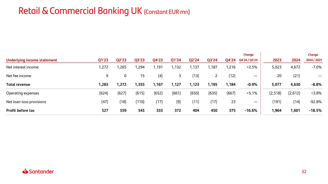 31 Retail & Commercial Banking UK (EUR mn) Change Change Underlying income statement Q1'23 Q2'23 Q3'23 Q4'23 Q1'24 Q2'24 Q3'24 Q4'24 Q4'24 / Q3'24 2023 2024 2024 / 2023 Net interest income 1,219 1,232 1,275 1,164 1,119 1,128 1,189 1,236 +4.0% 4,889 4,672 -4.4% Net fee income 9 0 14 (4) 3 (13) 2 (12) — 20 (21) — Total revenue 1,230 1,238 1,333 1,140 1,114 1,114 1,197 1,204 +0.6% 4,941 4,630 -6.3% Operating expenses (598) (611) (606) (637) (653) (645) (636) (678) +6.6% (2,451) (2,612) +6.6% Net loan-loss provisions (45) (17) (107) (17) (9) (11) (17) 23 — (186) (14) -92.6% Profit before tax 505 544 537 326 368 400 450 382 -15.1% 1,912 1,601 -16.3%