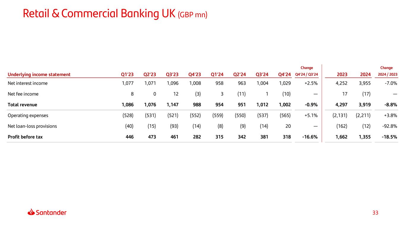 32 Retail & Commercial Banking UK (Constant EUR mn) Change Change Underlying income statement Q1'23 Q2'23 Q3'23 Q4'23 Q1'24 Q2'24 Q3'24 Q4'24 Q4'24 / Q3'24 2023 2024 2024 / 2023 Net interest income 1,272 1,265 1,294 1,191 1,132 1,137 1,187 1,216 +2.5% 5,023 4,672 -7.0% Net fee income 9 0 15 (4) 3 (13) 2 (12) — 20 (21) — Total revenue 1,283 1,272 1,355 1,167 1,127 1,123 1,195 1,184 -0.9% 5,077 4,630 -8.8% Operating expenses (624) (627) (615) (652) (661) (650) (635) (667) +5.1% (2,518) (2,612) +3.8% Net loan-loss provisions (47) (18) (110) (17) (9) (11) (17) 23 — (191) (14) -92.8% Profit before tax 527 559 545 333 372 404 450 375 -16.6% 1,964 1,601 -18.5%