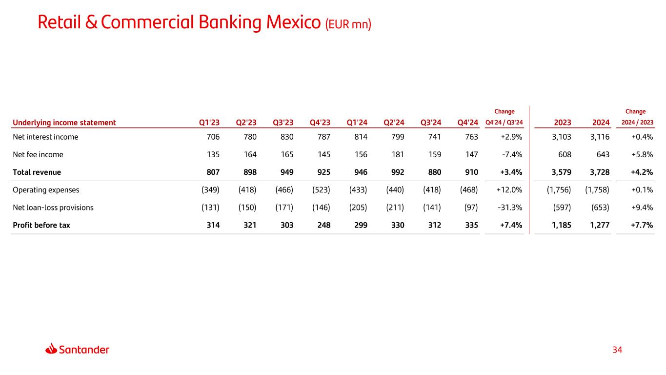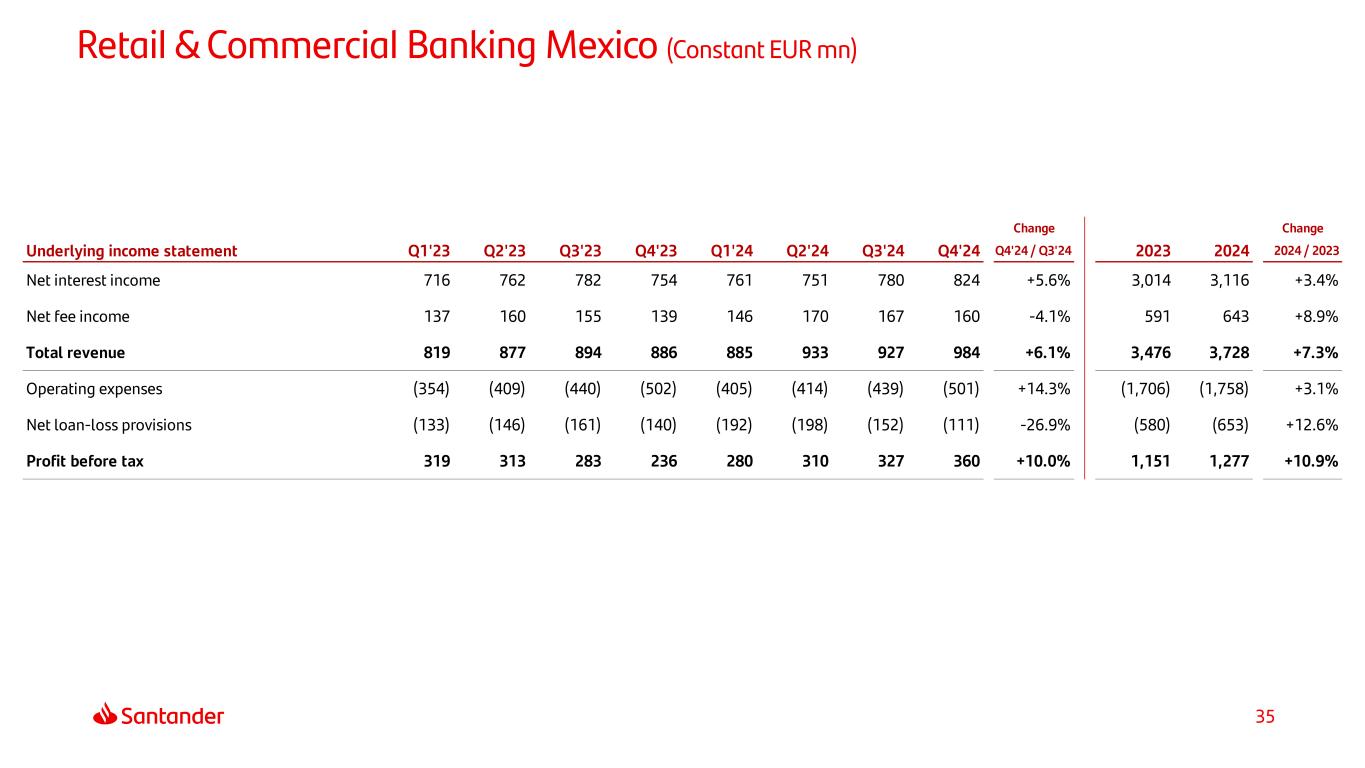 34 Retail & Commercial Banking Mexico (EUR mn) Change Change Underlying income statement Q1'23 Q2'23 Q3'23 Q4'23 Q1'24 Q2'24 Q3'24 Q4'24 Q4'24 / Q3'24 2023 2024 2024 / 2023 Net interest income 706 780 830 787 814 799 741 763 +2.9% 3,103 3,116 +0.4% Net fee income 135 164 165 145 156 181 159 147 -7.4% 608 643 +5.8% Total revenue 807 898 949 925 946 992 880 910 +3.4% 3,579 3,728 +4.2% Operating expenses (349) (418) (466) (523) (433) (440) (418) (468) +12.0% (1,756) (1,758) +0.1% Net loan-loss provisions (131) (150) (171) (146) (205) (211) (141) (97) -31.3% (597) (653) +9.4% Profit before tax 314 321 303 248 299 330 312 335 +7.4% 1,185 1,277 +7.7%