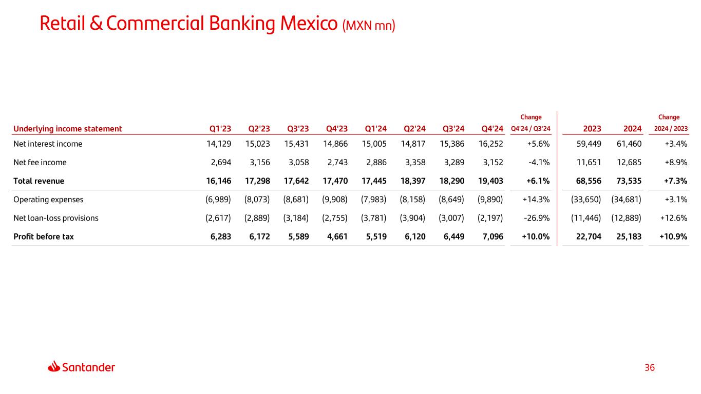 35 Retail & Commercial Banking Mexico (Constant EUR mn) Change Change Underlying income statement Q1'23 Q2'23 Q3'23 Q4'23 Q1'24 Q2'24 Q3'24 Q4'24 Q4'24 / Q3'24 2023 2024 2024 / 2023 Net interest income 716 762 782 754 761 751 780 824 +5.6% 3,014 3,116 +3.4% Net fee income 137 160 155 139 146 170 167 160 -4.1% 591 643 +8.9% Total revenue 819 877 894 886 885 933 927 984 +6.1% 3,476 3,728 +7.3% Operating expenses (354) (409) (440) (502) (405) (414) (439) (501) +14.3% (1,706) (1,758) +3.1% Net loan-loss provisions (133) (146) (161) (140) (192) (198) (152) (111) -26.9% (580) (653) +12.6% Profit before tax 319 313 283 236 280 310 327 360 +10.0% 1,151 1,277 +10.9%