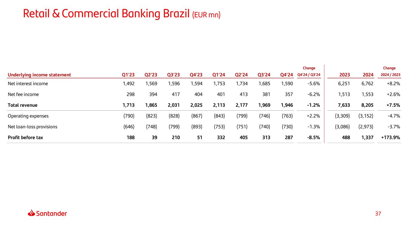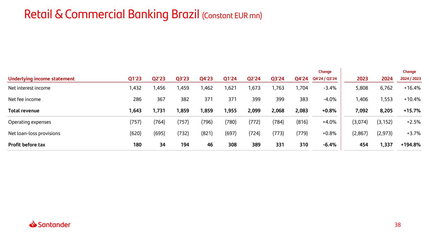 37 Retail & Commercial Banking Brazil (EUR mn) Change Change Underlying income statement Q1'23 Q2'23 Q3'23 Q4'23 Q1'24 Q2'24 Q3'24 Q4'24 Q4'24 / Q3'24 2023 2024 2024 / 2023 Net interest income 1,492 1,569 1,596 1,594 1,753 1,734 1,685 1,590 -5.6% 6,251 6,762 +8.2% Net fee income 298 394 417 404 401 413 381 357 -6.2% 1,513 1,553 +2.6% Total revenue 1,713 1,865 2,031 2,025 2,113 2,177 1,969 1,946 -1.2% 7,633 8,205 +7.5% Operating expenses (790) (823) (828) (867) (843) (799) (746) (763) +2.2% (3,309) (3,152) -4.7% Net loan-loss provisions (646) (748) (799) (893) (753) (751) (740) (730) -1.3% (3,086) (2,973) -3.7% Profit before tax 188 39 210 51 332 405 313 287 -8.5% 488 1,337 +173.9%
