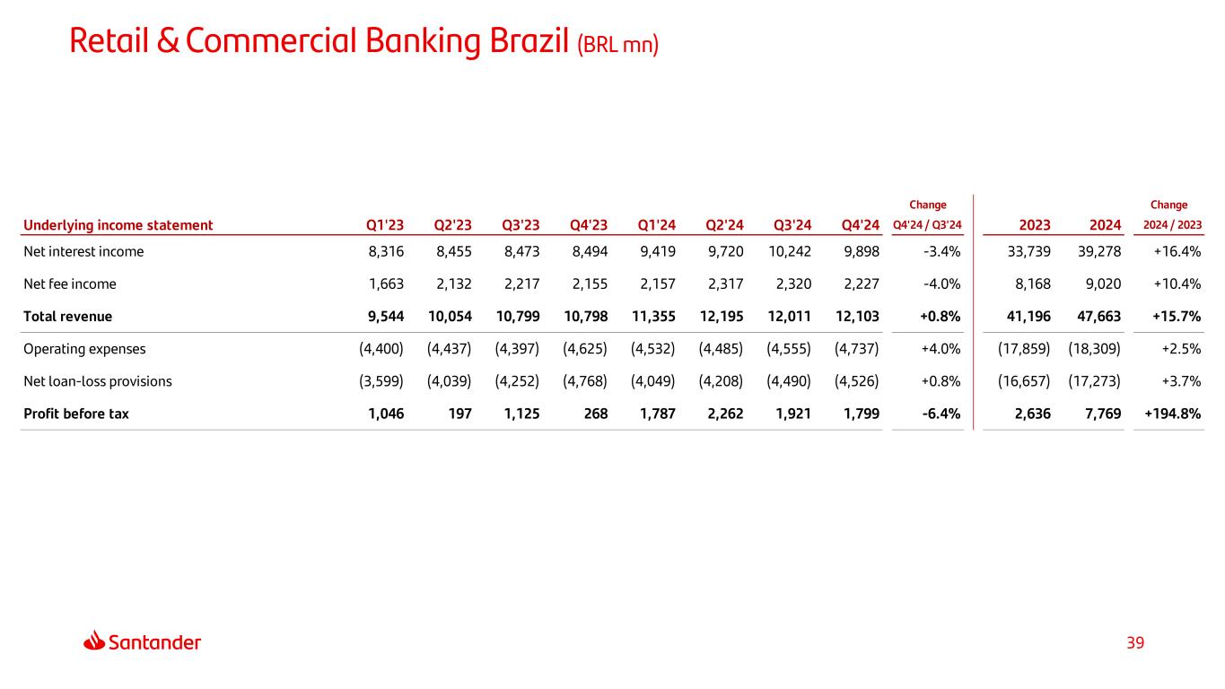 38 Retail & Commercial Banking Brazil (Constant EUR mn) Change Change Underlying income statement Q1'23 Q2'23 Q3'23 Q4'23 Q1'24 Q2'24 Q3'24 Q4'24 Q4'24 / Q3'24 2023 2024 2024 / 2023 Net interest income 1,432 1,456 1,459 1,462 1,621 1,673 1,763 1,704 -3.4% 5,808 6,762 +16.4% Net fee income 286 367 382 371 371 399 399 383 -4.0% 1,406 1,553 +10.4% Total revenue 1,643 1,731 1,859 1,859 1,955 2,099 2,068 2,083 +0.8% 7,092 8,205 +15.7% Operating expenses (757) (764) (757) (796) (780) (772) (784) (816) +4.0% (3,074) (3,152) +2.5% Net loan-loss provisions (620) (695) (732) (821) (697) (724) (773) (779) +0.8% (2,867) (2,973) +3.7% Profit before tax 180 34 194 46 308 389 331 310 -6.4% 454 1,337 +194.8%