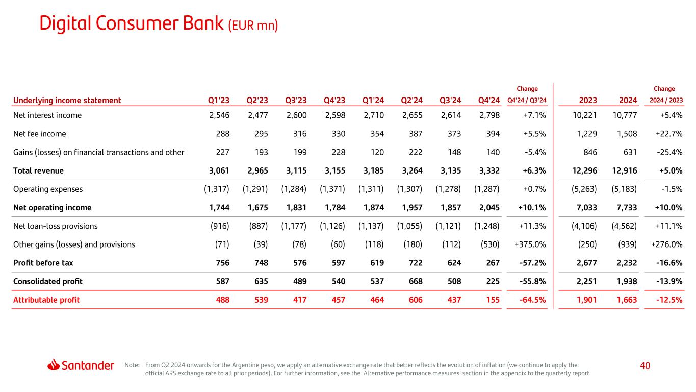 40 Digital Consumer Bank (EUR mn) Change Change Underlying income statement Q1'23 Q2'23 Q3'23 Q4'23 Q1'24 Q2'24 Q3'24 Q4'24 Q4'24 / Q3'24 2023 2024 2024 / 2023 Net interest income 2,546 2,477 2,600 2,598 2,710 2,655 2,614 2,798 +7.1% 10,221 10,777 +5.4% Net fee income 288 295 316 330 354 387 373 394 +5.5% 1,229 1,508 +22.7% Gains (losses) on financial transactions and other 227 193 199 228 120 222 148 140 -5.4% 846 631 -25.4% Total revenue 3,061 2,965 3,115 3,155 3,185 3,264 3,135 3,332 +6.3% 12,296 12,916 +5.0% Operating expenses (1,317) (1,291) (1,284) (1,371) (1,311) (1,307) (1,278) (1,287) +0.7% (5,263) (5,183) -1.5% Net operating income 1,744 1,675 1,831 1,784 1,874 1,957 1,857 2,045 +10.1% 7,033 7,733 +10.0% Net loan-loss provisions (916) (887) (1,177) (1,126) (1,137) (1,055) (1,121) (1,248) +11.3% (4,106) (4,562) +11.1% Other gains (losses) and provisions (71) (39) (78) (60) (118) (180) (112) (530) +375.0% (250) (939) +276.0% Profit before tax 756 748 576 597 619 722 624 267 -57.2% 2,677 2,232 -16.6% Consolidated profit 587 635 489 540 537 668 508 225 -55.8% 2,251 1,938 -13.9% Attributable profit 488 539 417 457 464 606 437 155 -64.5% 1,901 1,663 -12.5% Note: From Q2 2024 onwards for the Argentine peso, we apply an alternative exchange rate that better reflects the evolution of inflation (we continue to apply the official ARS exchange rate to all prior periods). For further information, see the 'Alternative performance measures' section in the appendix to the quarterly report.