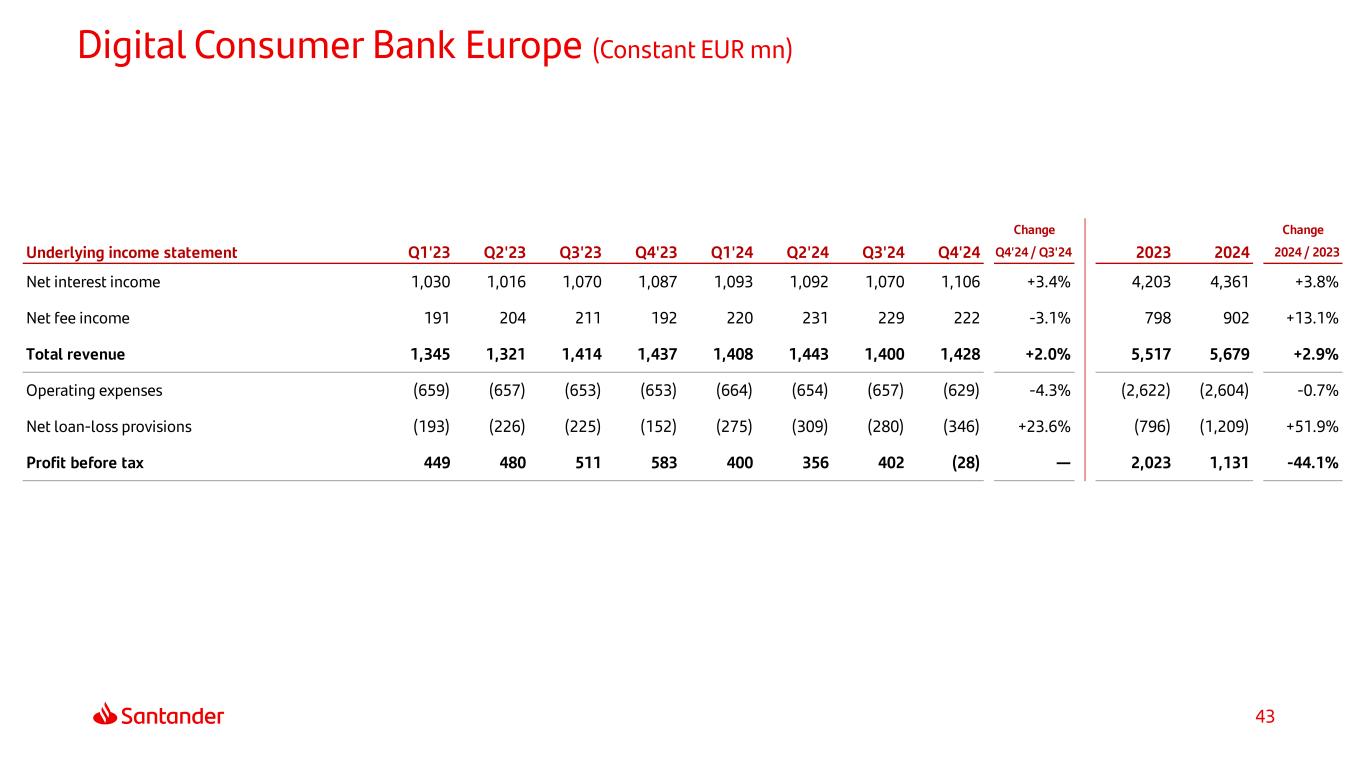 42 Digital Consumer Bank Europe (EUR mn) Change Change Underlying income statement Q1'23 Q2'23 Q3'23 Q4'23 Q1'24 Q2'24 Q3'24 Q4'24 Q4'24 / Q3'24 2023 2024 2024 / 2023 Net interest income 1,029 1,011 1,069 1,083 1,095 1,092 1,069 1,105 +3.4% 4,193 4,361 +4.0% Net fee income 191 203 210 192 220 231 229 222 -3.1% 796 902 +13.4% Total revenue 1,343 1,315 1,411 1,433 1,410 1,444 1,398 1,427 +2.1% 5,502 5,679 +3.2% Operating expenses (659) (655) (652) (652) (665) (655) (656) (629) -4.2% (2,618) (2,604) -0.5% Net loan-loss provisions (193) (222) (225) (152) (276) (308) (279) (345) +23.6% (792) (1,209) +52.6% Profit before tax 447 481 509 582 401 356 402 (28) — 2,019 1,131 -44.0%