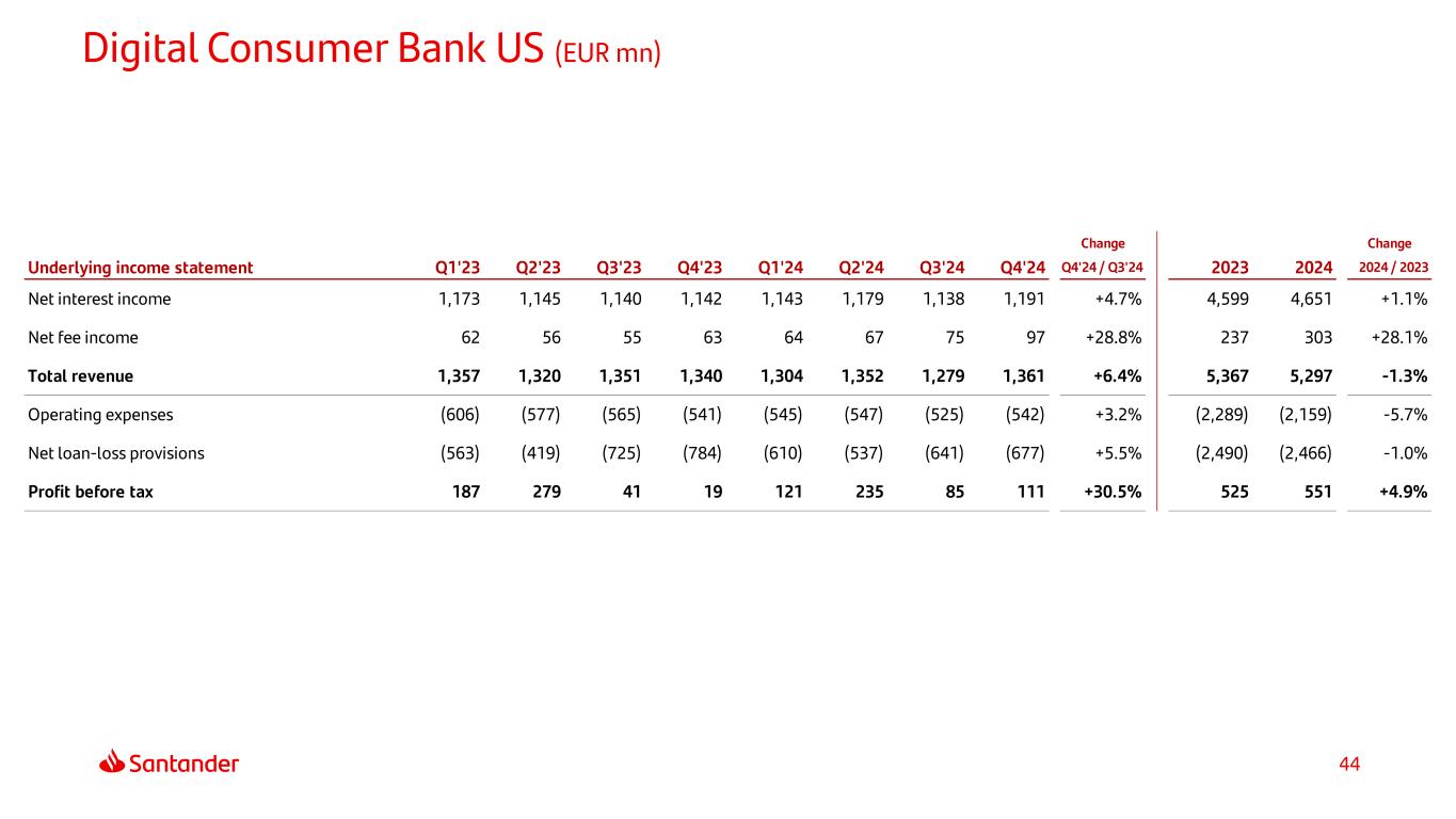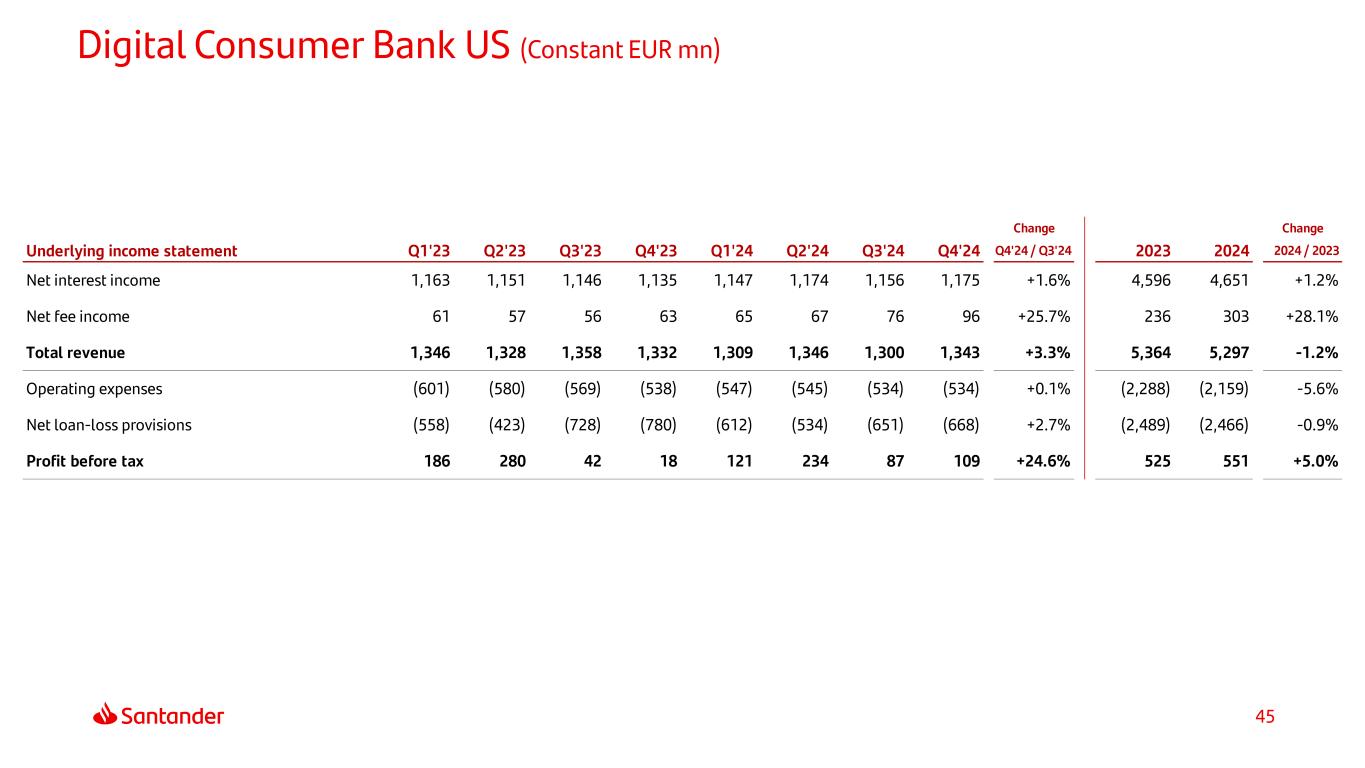 44 Digital Consumer Bank US (EUR mn) Change Change Underlying income statement Q1'23 Q2'23 Q3'23 Q4'23 Q1'24 Q2'24 Q3'24 Q4'24 Q4'24 / Q3'24 2023 2024 2024 / 2023 Net interest income 1,173 1,145 1,140 1,142 1,143 1,179 1,138 1,191 +4.7% 4,599 4,651 +1.1% Net fee income 62 56 55 63 64 67 75 97 +28.8% 237 303 +28.1% Total revenue 1,357 1,320 1,351 1,340 1,304 1,352 1,279 1,361 +6.4% 5,367 5,297 -1.3% Operating expenses (606) (577) (565) (541) (545) (547) (525) (542) +3.2% (2,289) (2,159) -5.7% Net loan-loss provisions (563) (419) (725) (784) (610) (537) (641) (677) +5.5% (2,490) (2,466) -1.0% Profit before tax 187 279 41 19 121 235 85 111 +30.5% 525 551 +4.9%